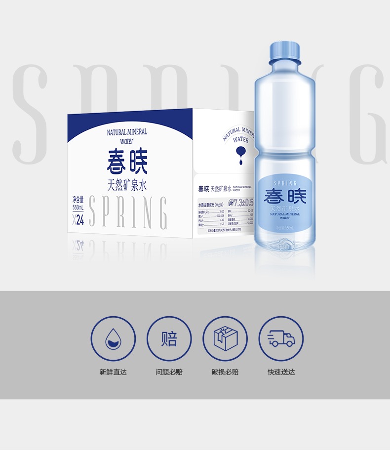 天猫春晓饮品旗舰店59.9元,可领30元优惠券,实付29.9元到手,到手550ml*24瓶。整箱包装,水质最好,同时也是国标最严格的天然矿泉水,饮用健康。