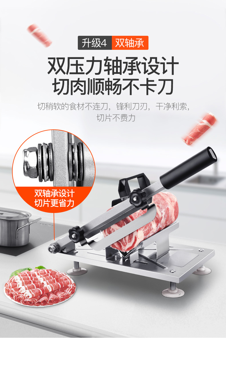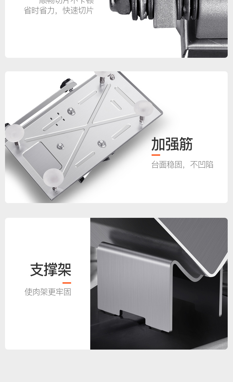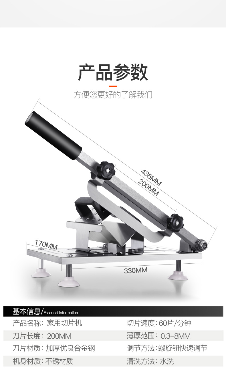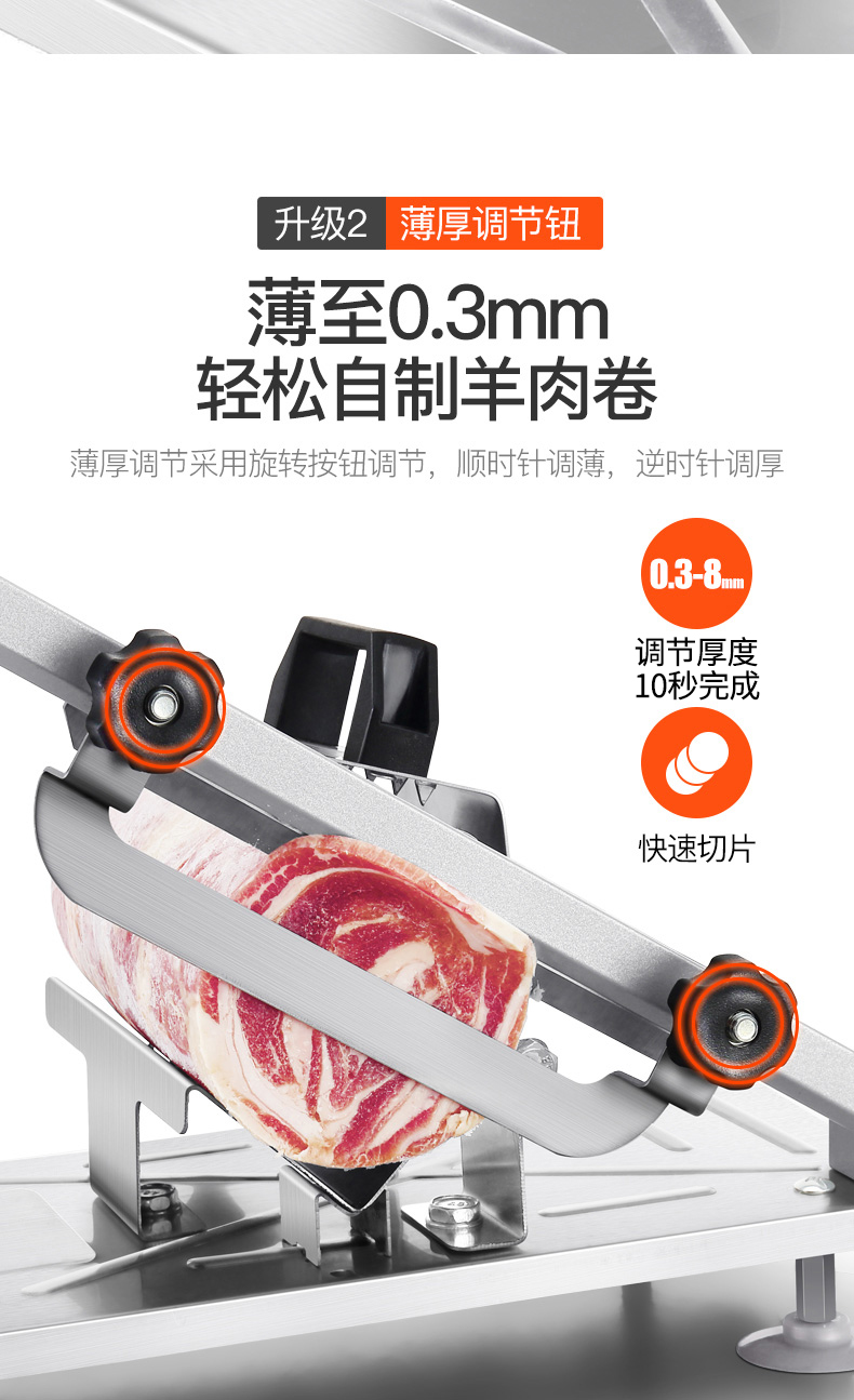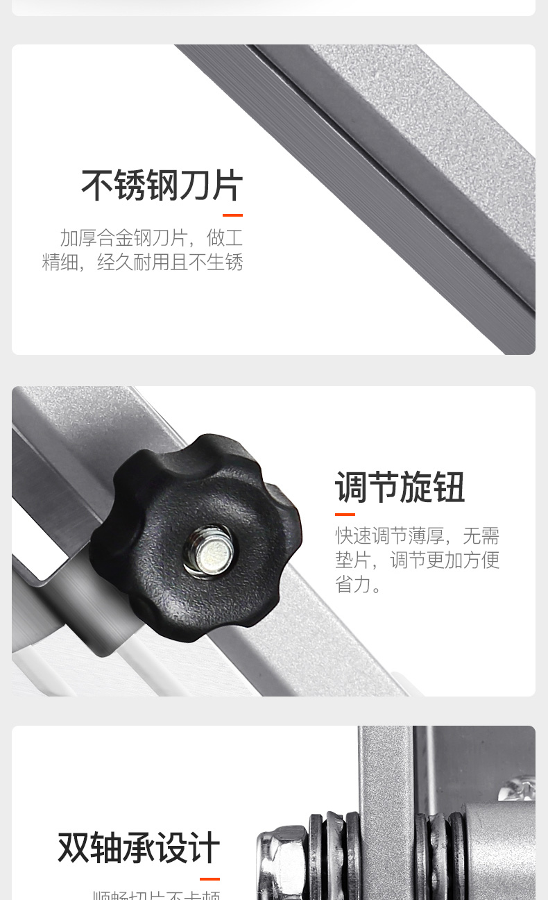这款微力切片机受力处均为优质不锈钢制作,坚固耐用,切片省力,底部有高回弹弹簧,送肉安全省力,刀片可在0.3mm-8mm之间调节,可按照自己喜好切厚薄,单次打磨可连续切上百斤冻肉,刀片可持续打磨5次,中部V型托架,向下按压不变形,坚固固定不滑动。