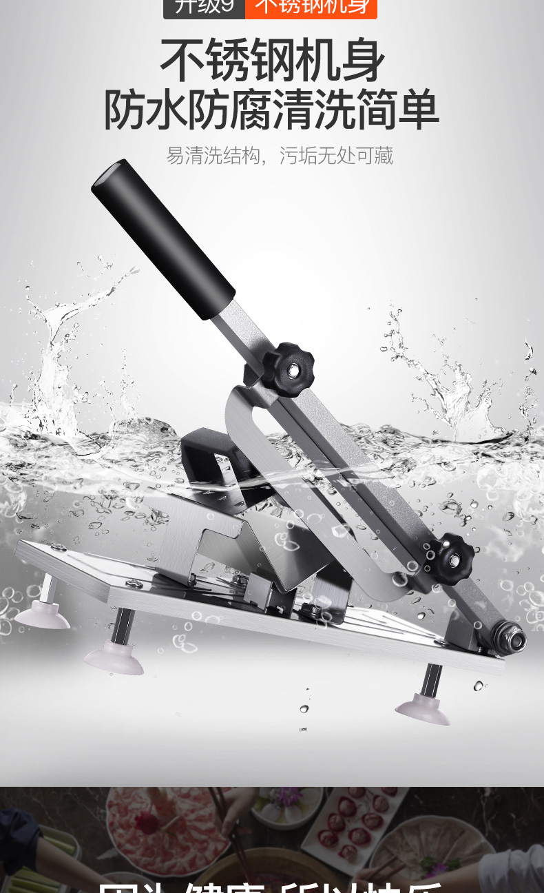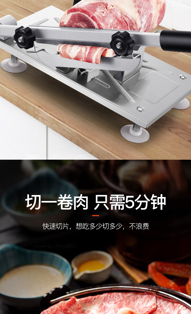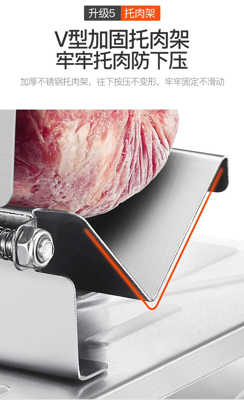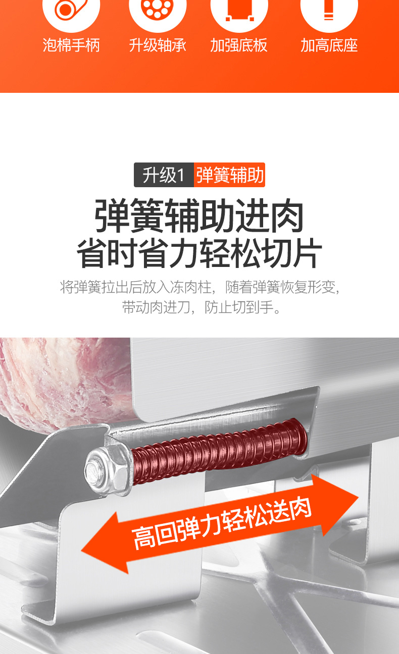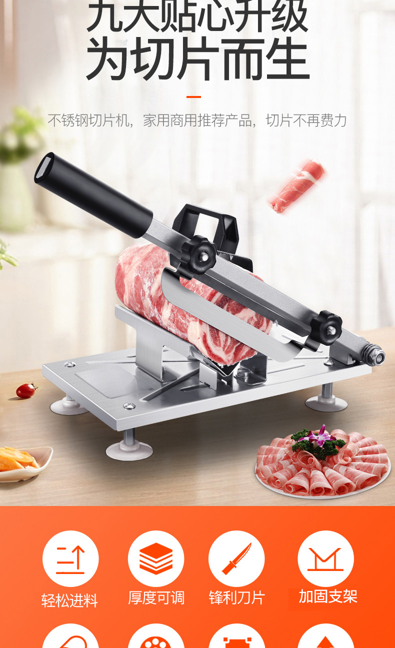 这款微力切片机受力处均为优质不锈钢制作,坚固耐用,切片省力,底部有高回弹弹簧,送肉安全省力,刀片可在0.3mm-8mm之间调节,可按照自己喜好切厚薄,单次打磨可连续切上百斤冻肉,刀片可持续打磨5次,中部V型托架,向下按压不变形,坚固固定不滑动。