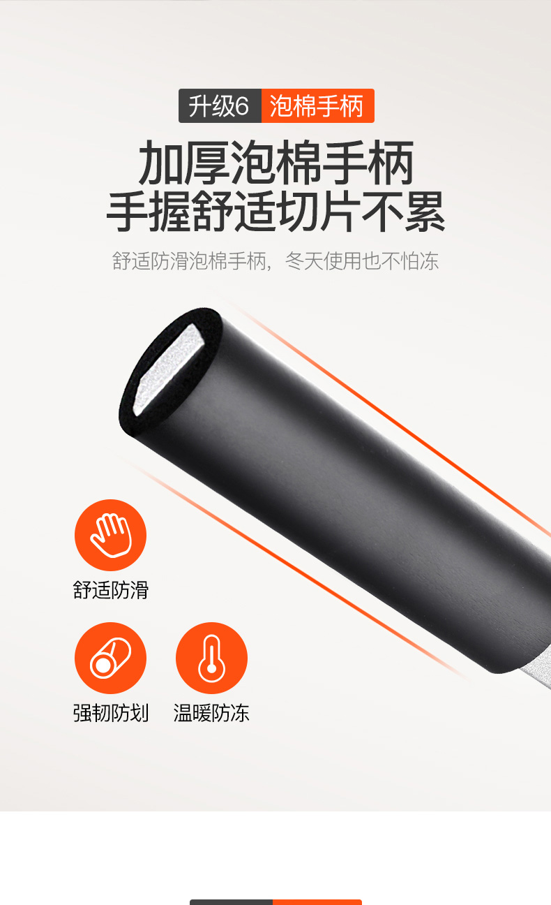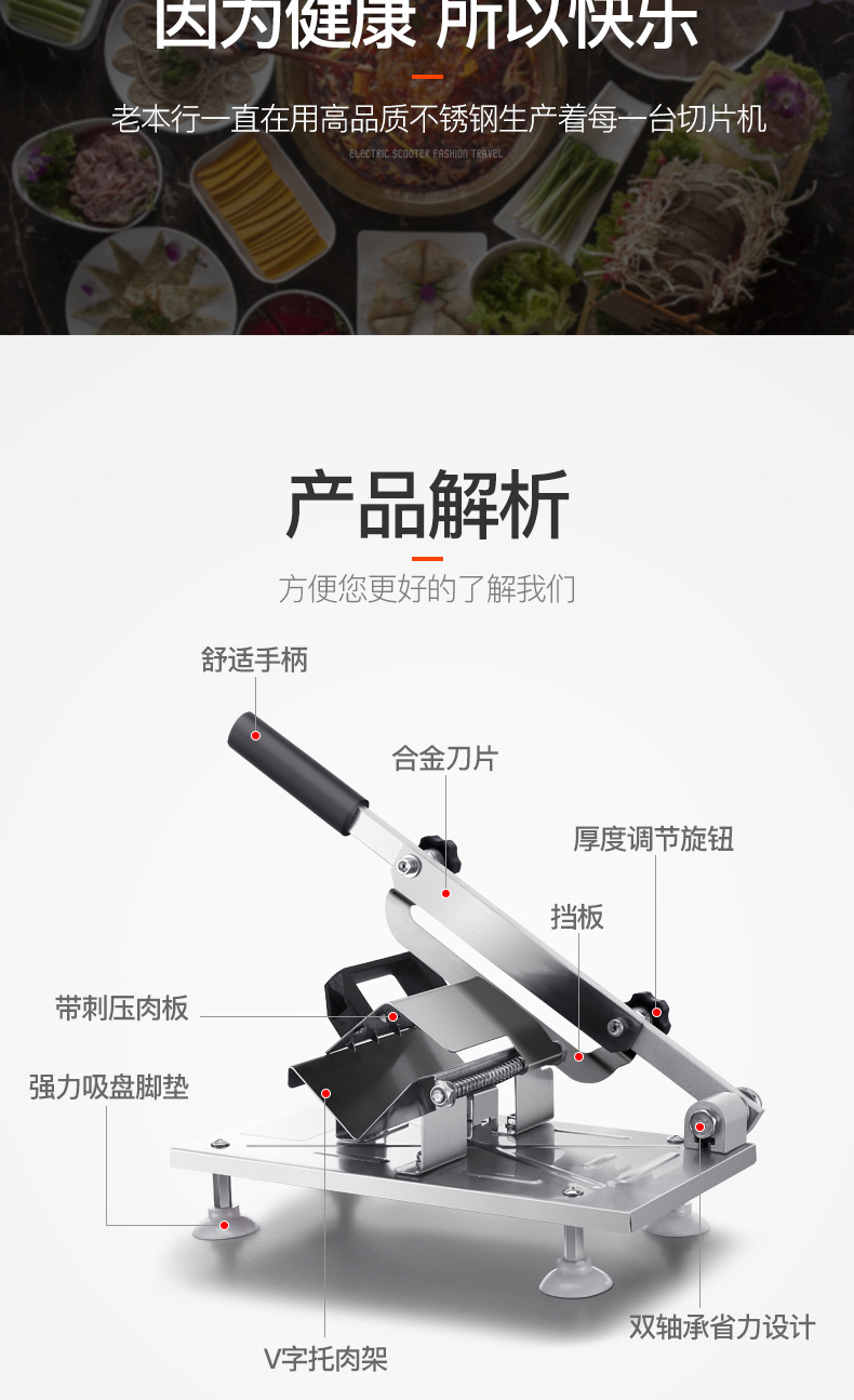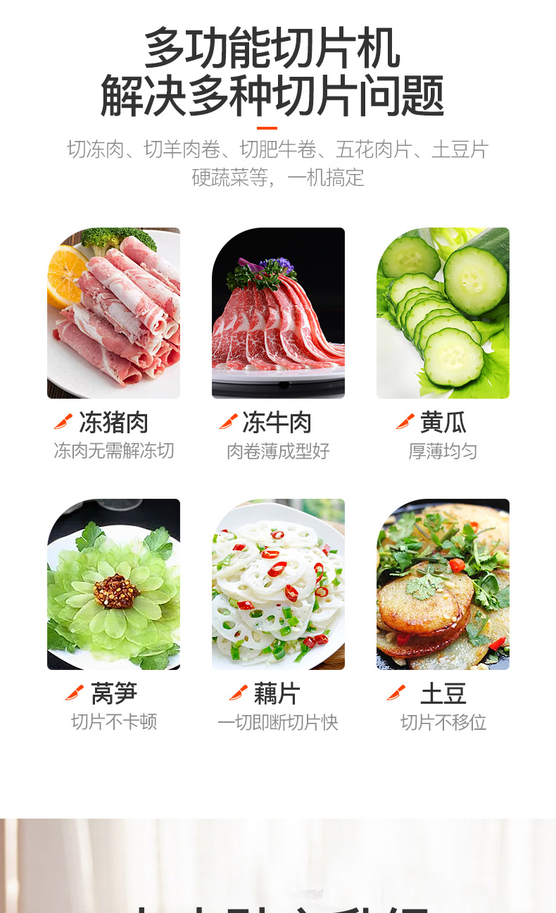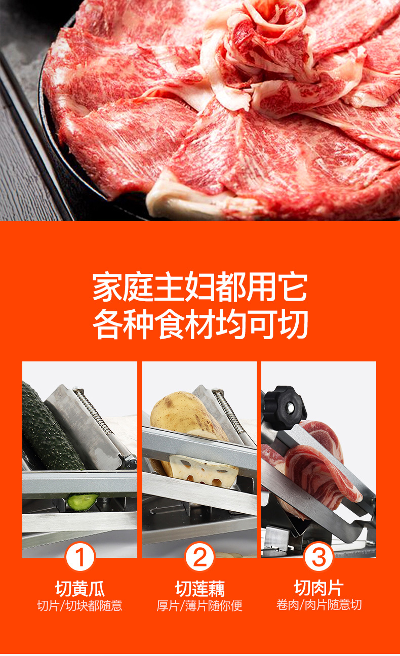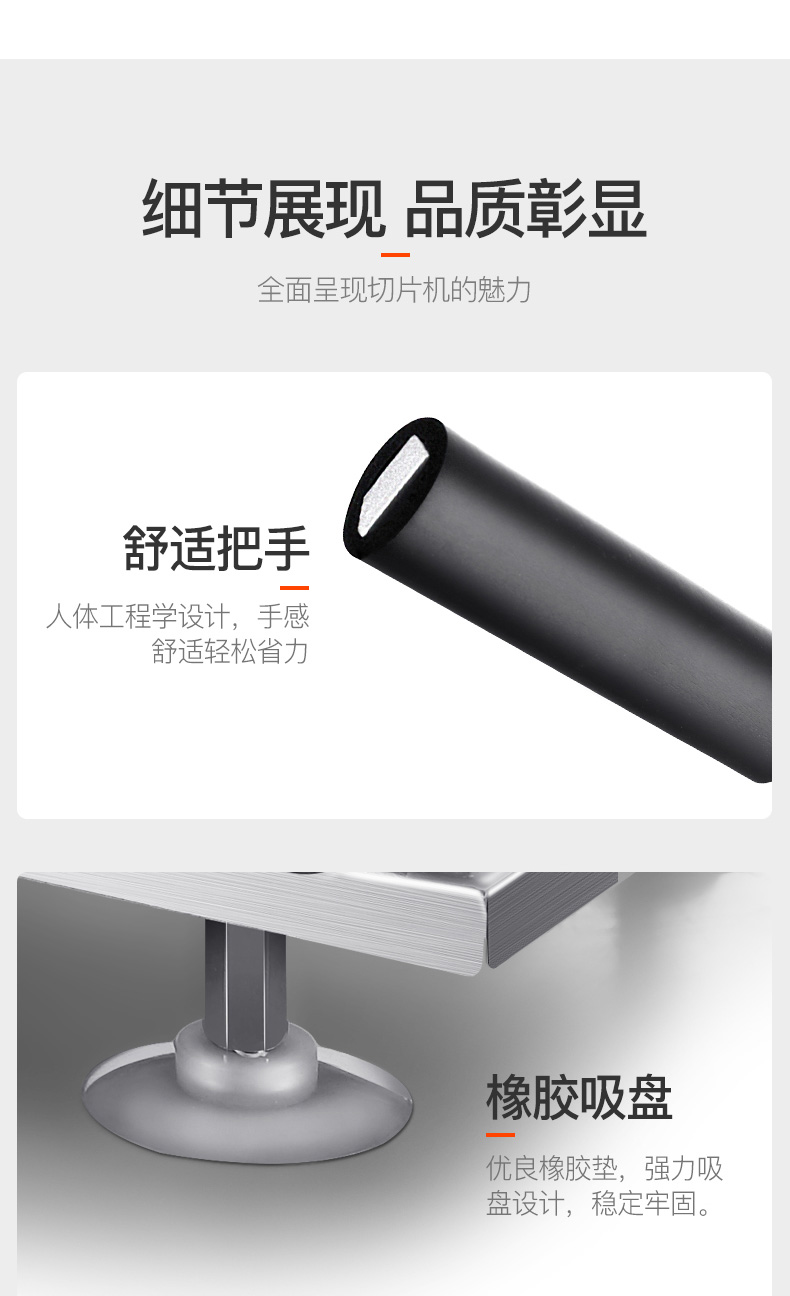 这款微力切片机受力处均为优质不锈钢制作,坚固耐用,切片省力,底部有高回弹弹簧,送肉安全省力,刀片可在0.3mm-8mm之间调节,可按照自己喜好切厚薄,单次打磨可连续切上百斤冻肉,刀片可持续打磨5次,中部V型托架,向下按压不变形,坚固固定不滑动。