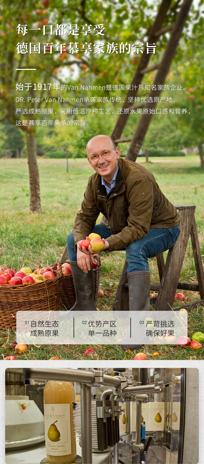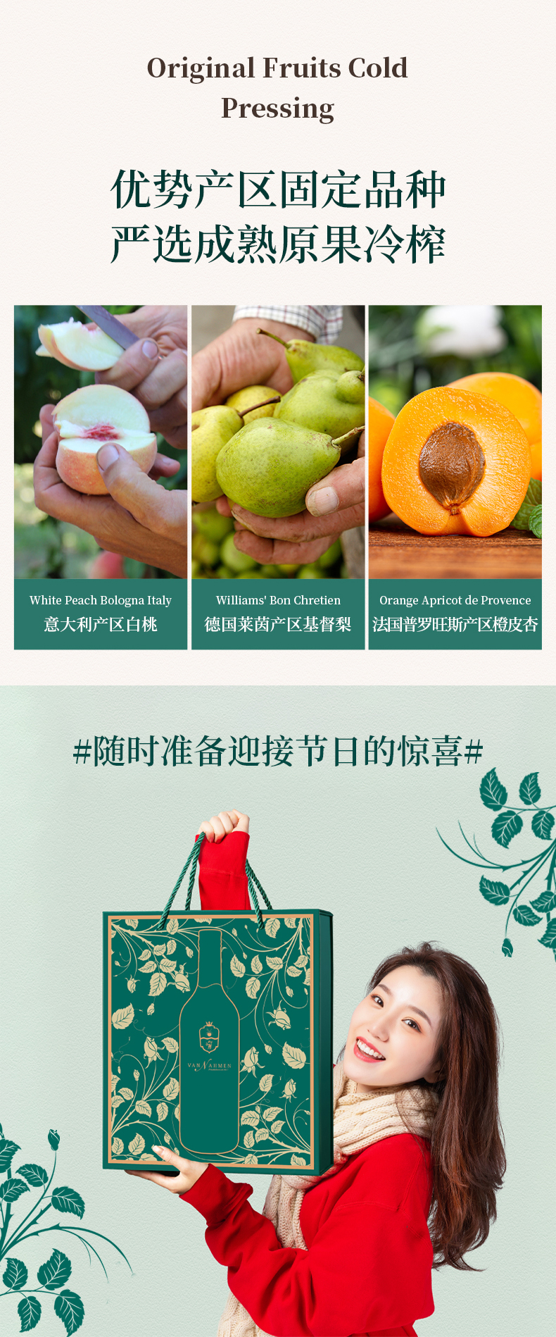 为了保证水果品质,甄选欧洲优势产区,指定果园单一品种原果,经过严苛挑选后,原果低温冷榨,避免了高温氧化,减少变色变味,更好的保留营养和味道,无色素、无香精、无防腐剂,巴士杀菌后直接热灌装封瓶,减少受热时间,降低对风味营养破坏。