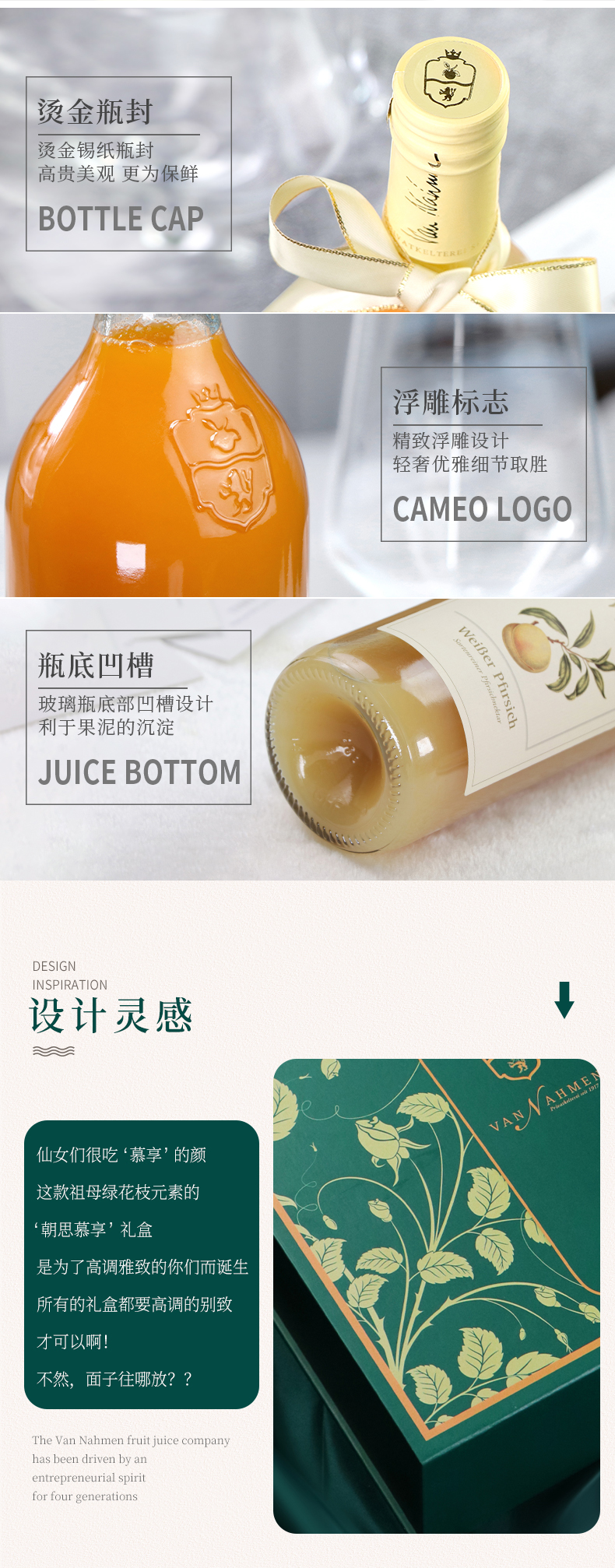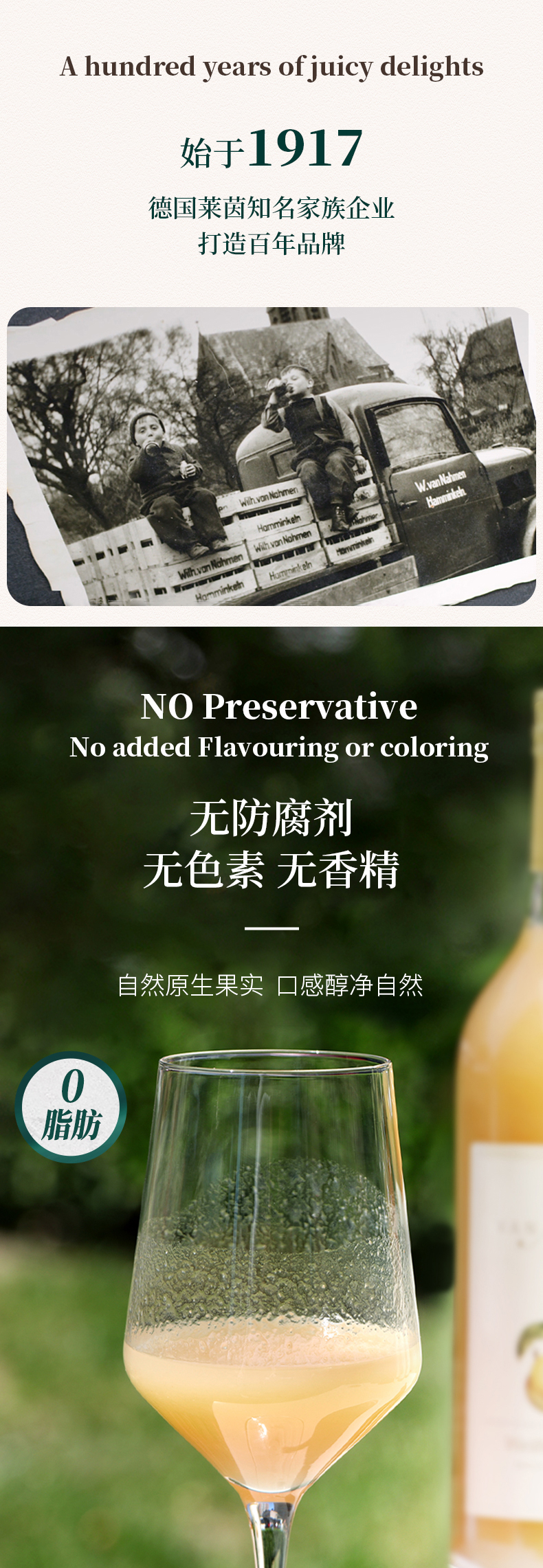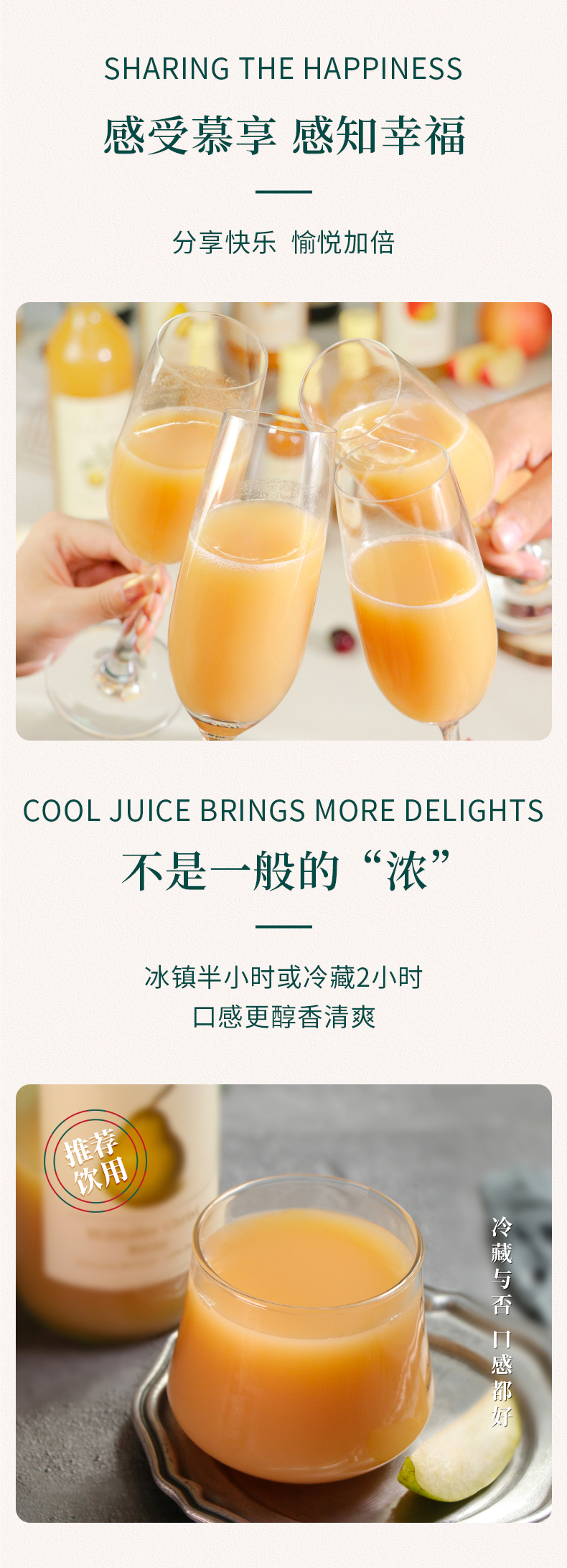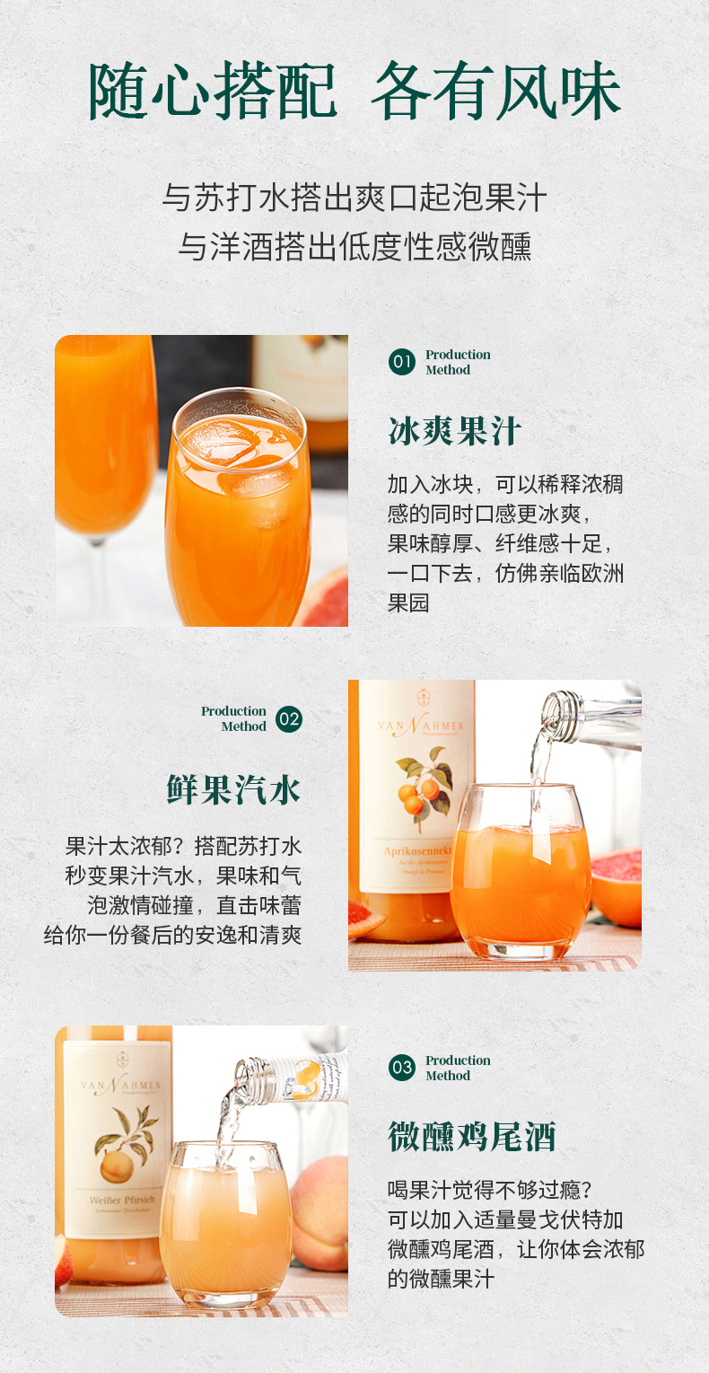 德国百年品牌,2020年德国农业协会DLG7项金牌得主,上过很多米其林餐桌,欧洲葡萄酒大师MW也在跨界安利的果汁,果汁真实原果冷榨,非浓缩复原,不经过滤,果汁浓稠醇厚,冰镇后更加醇香清爽。可加入冰块稀释浓稠感同时口感更冰爽;也可搭配苏打水DIY爽口果汁汽水、或与洋酒搭配出低度微醺鸡尾酒。