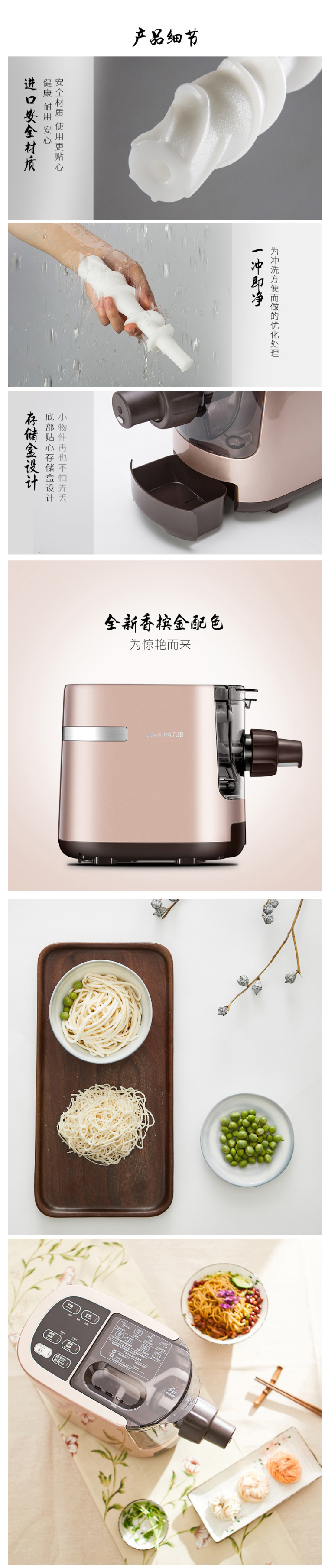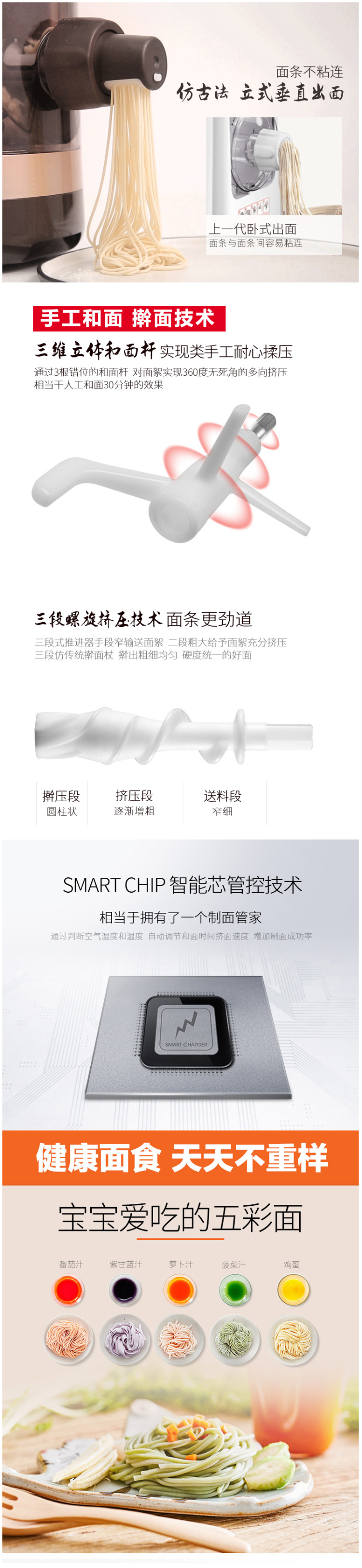 SMART CHIP智能芯管控制技术,自动调节和面时间和速度,还有断电记忆功能;立体三维和面杆,仿手工耐心揉压,加上三段螺旋挤压,制作出来的面条更劲道;配有6种模具头,可做细面、粗面、龙须面、手擀面、空心面、烩面,尺寸是375*200*275mm。