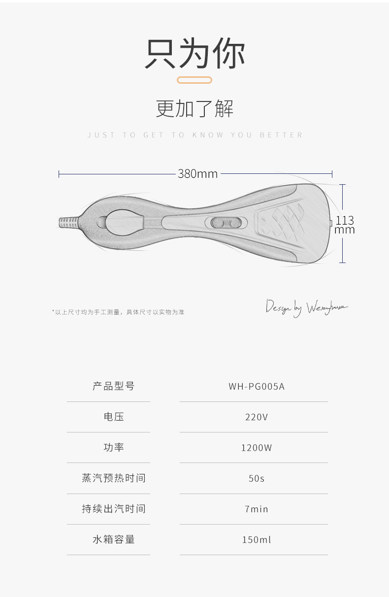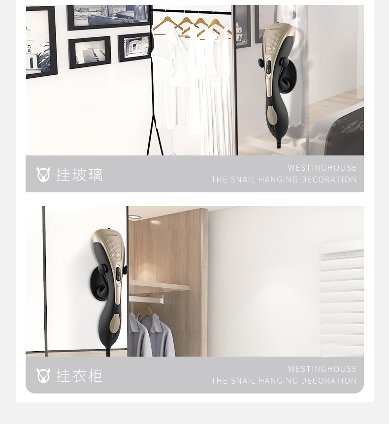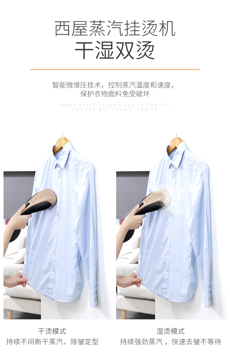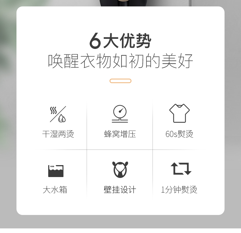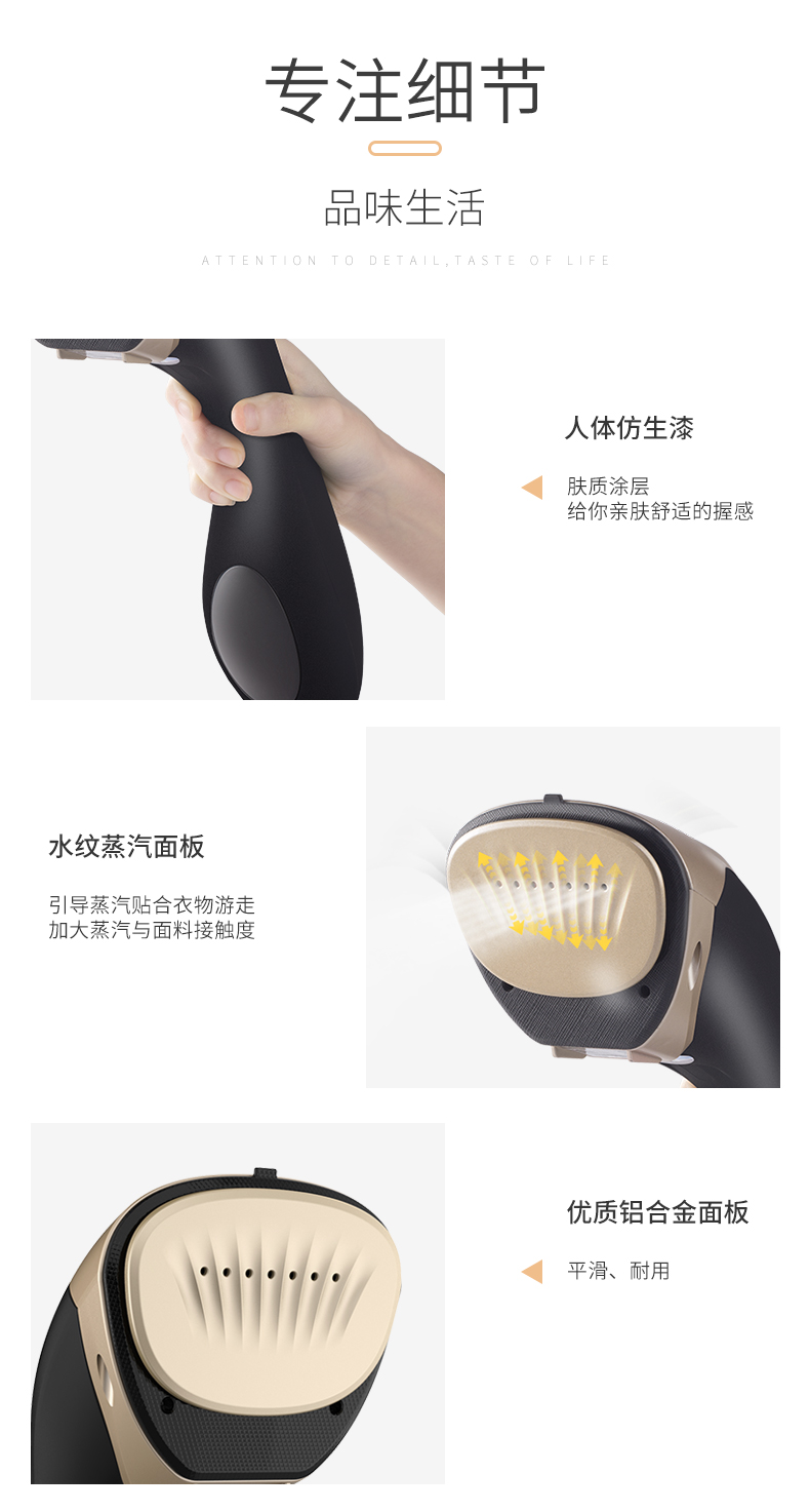 细节上:特有的双加热技术,蜂窝回旋加热雾化,增压聚能压力仓加压,蒸汽输出可达1米,智能精细控温,温度适宜,蒸汽细腻,呵护高贵面料。高颜值外观设计,流线型形机身,握感舒适,蜗牛式壁挂装饰,小巧不占地方,让生活更加充满艺术感。