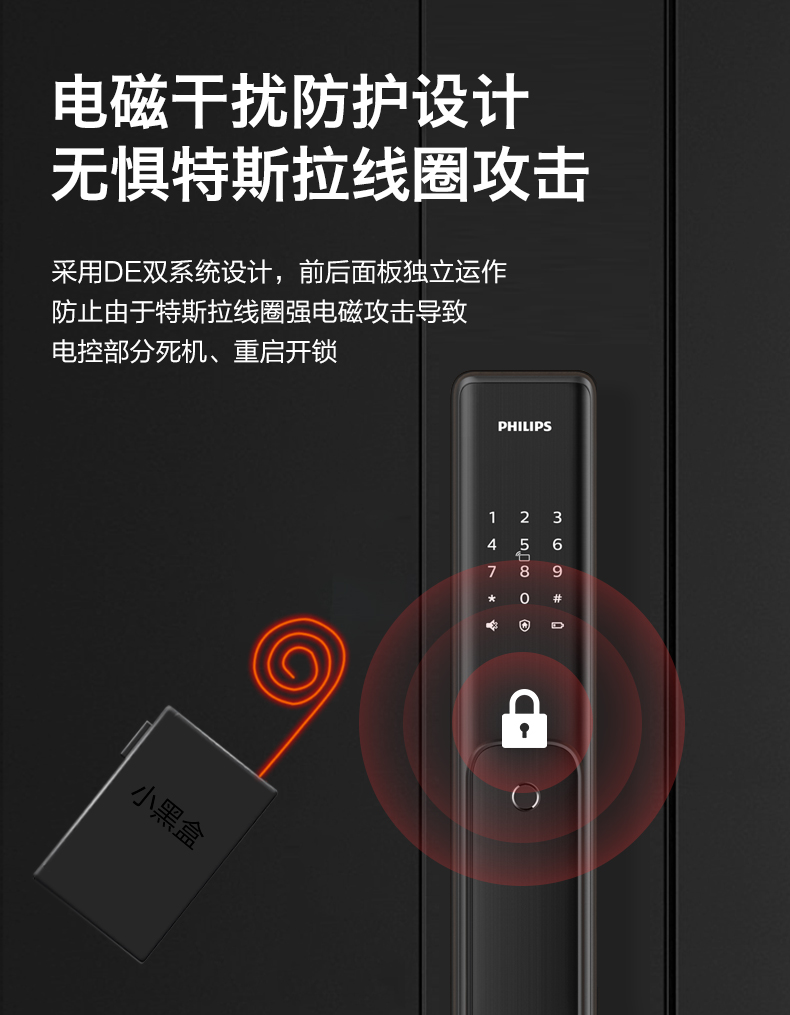 1 采用DE双系统设计,前后面板独立运作,防止由于特斯拉线圈强电磁攻击导致电控部分死机、重启开锁;