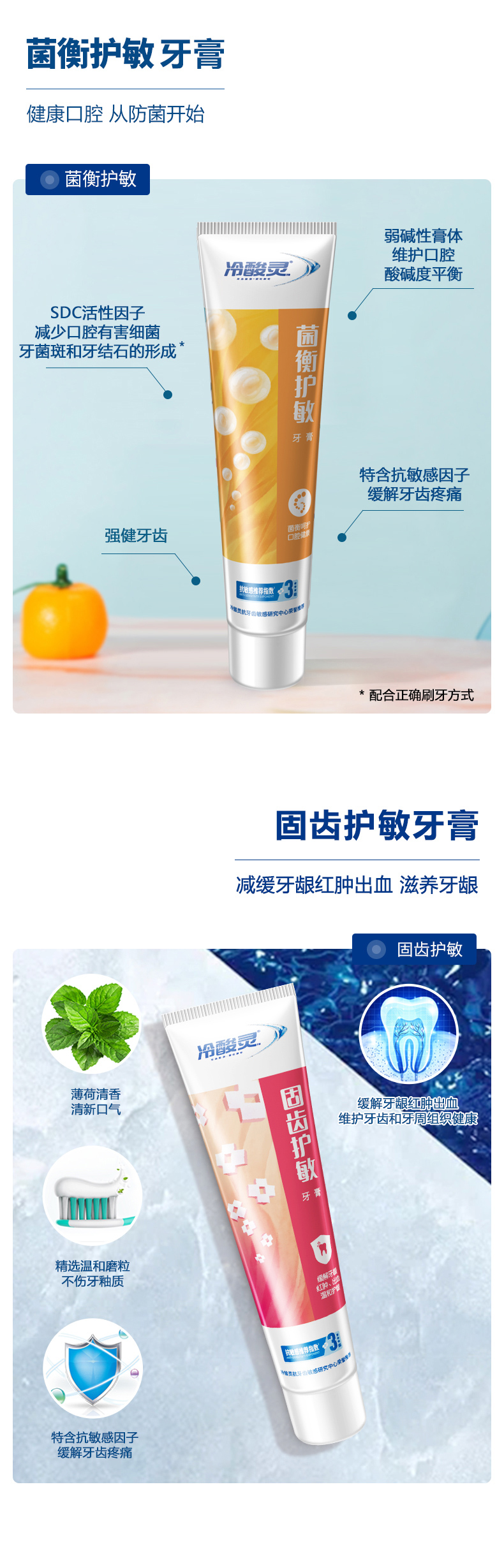 冷酸灵菌衡护敏牙膏:清爽薄荷香、莹白膏体。含抗敏感活性因子,缓解牙齿敏感疼痛;特含SDC健齿素,能持续抵抗牙菌斑;弱碱性膏体,维护口腔酸碱度平衡。