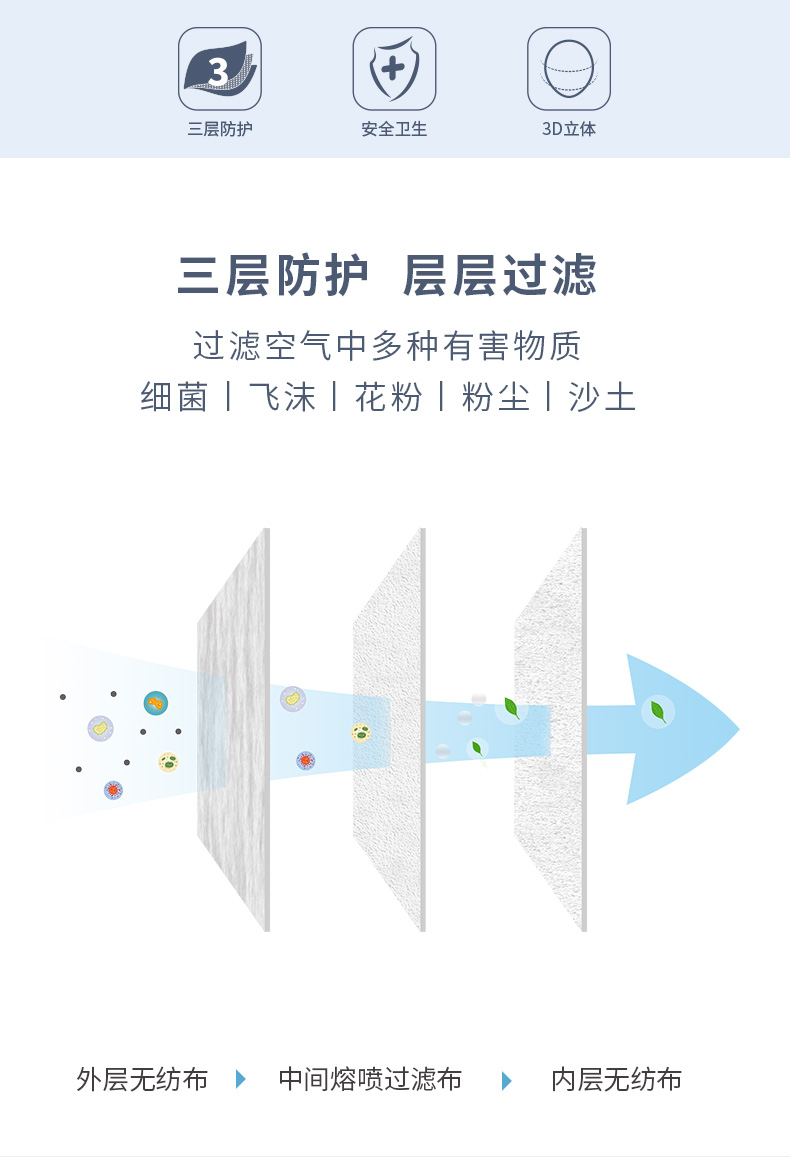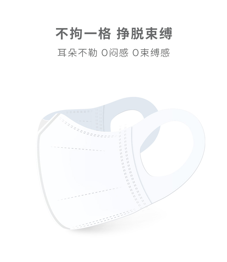 这款unifree 一次性3D立体口罩,外层无纺布,中间熔喷过滤布,内层无纺布,三层防护,过滤空气中的多种有害物质。立体剪裁,适合大多数脸型,舒适贴合,鼻梁处折角佩戴效果更贴合,密封性更好。无纺布耳带,透气,抗拉扯,佩戴舒适。
