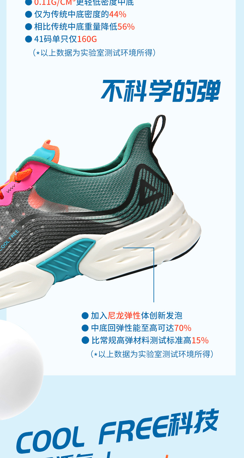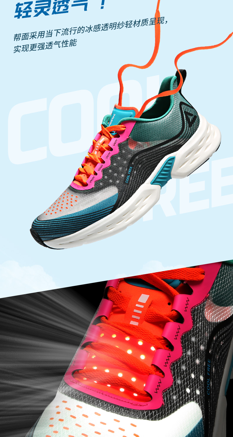 鞋面是搭载COOL FREE科技的冰感透明纱材质,轻灵透气,保持更强的透气性能,其它的细节方面,中底融合了轻质TPU,保持中底在运动时的稳定性和抗扭性,鞋底分块橡胶材质,防止中底的过度磨损,提高整鞋的耐用性。