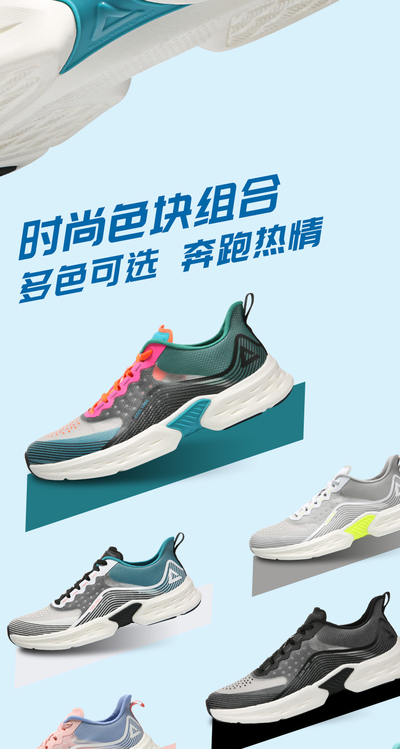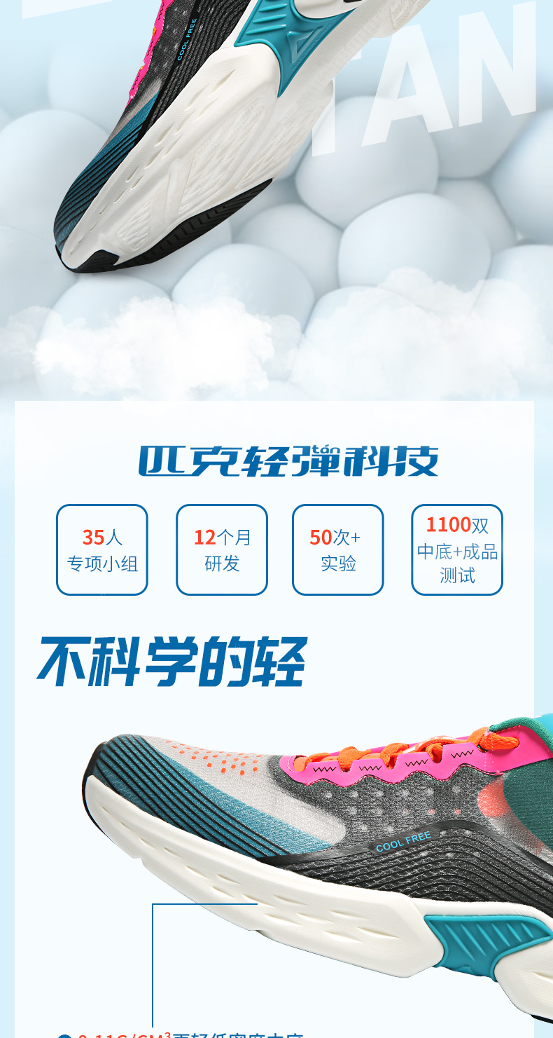 核心的中底部分,使用自研创新的发泡工艺,在平常的EVA发泡中加入尼龙弹性体,合理配比新型橡塑复合材料,在轻、弹、耐久等跑鞋核心性能中寻找平衡点,35人专项小组通过12个月研发,因为有了态极的口碑,这款轻弹自发布以来也一直是匹克的爆款。