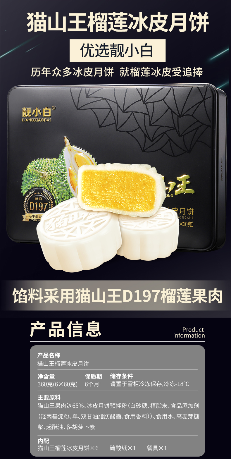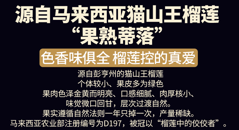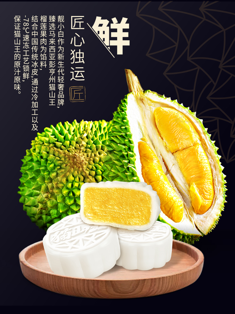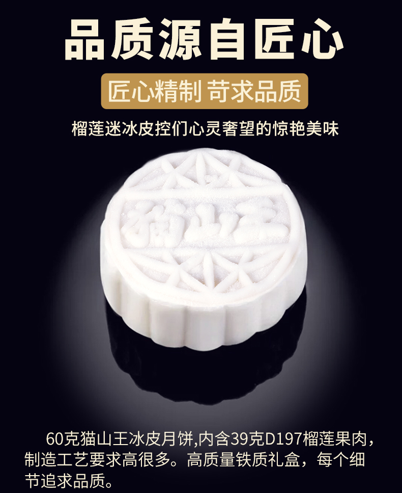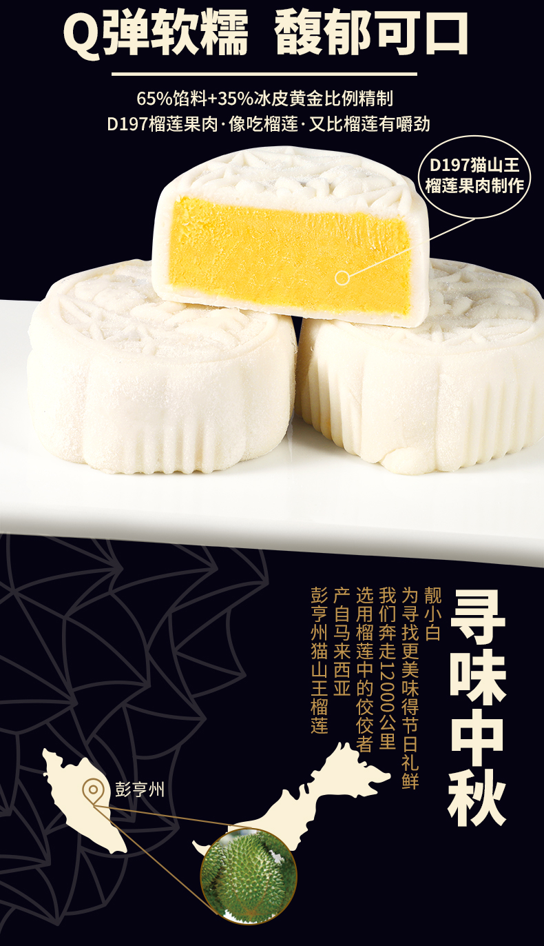 甄选 马来西亚D197猫山王榴莲为馅,果肉占比高达65%,皮薄馅足,奶黄浓郁,香甜软滑,让你回味无穷的好口感,意满流心,超好吃!
