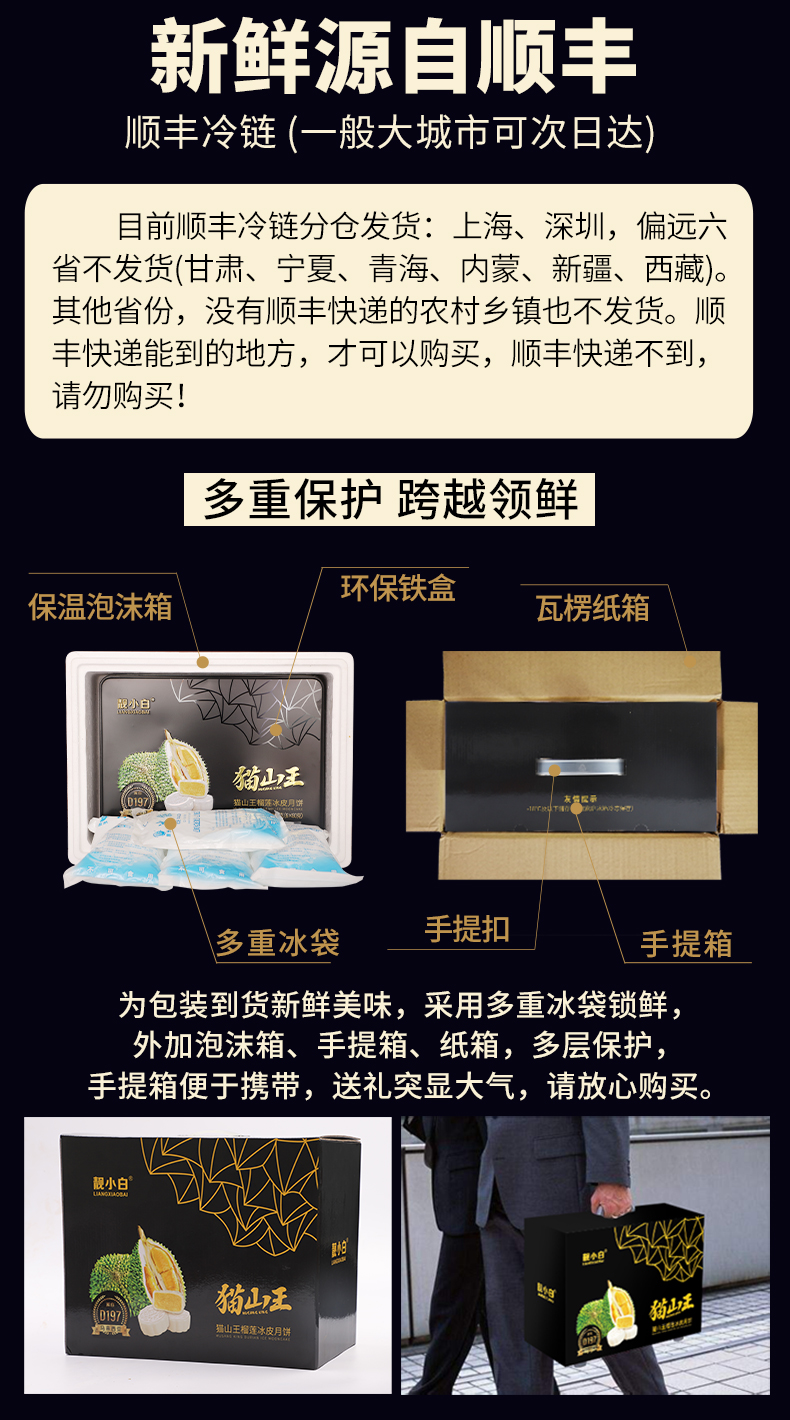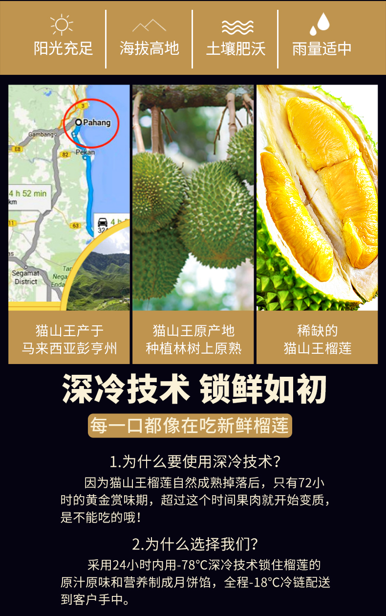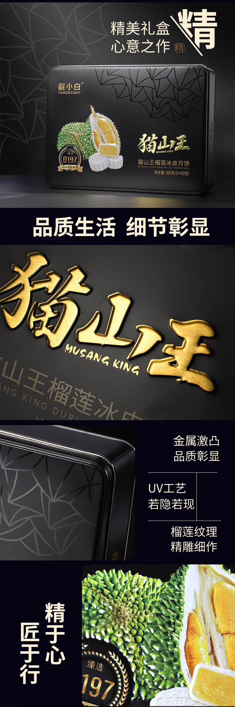 甄选 马来西亚D197猫山王榴莲为馅,果肉占比高达65%,皮薄馅足,奶黄浓郁,香甜软滑,让你回味无穷的好口感,意满流心,超好吃!