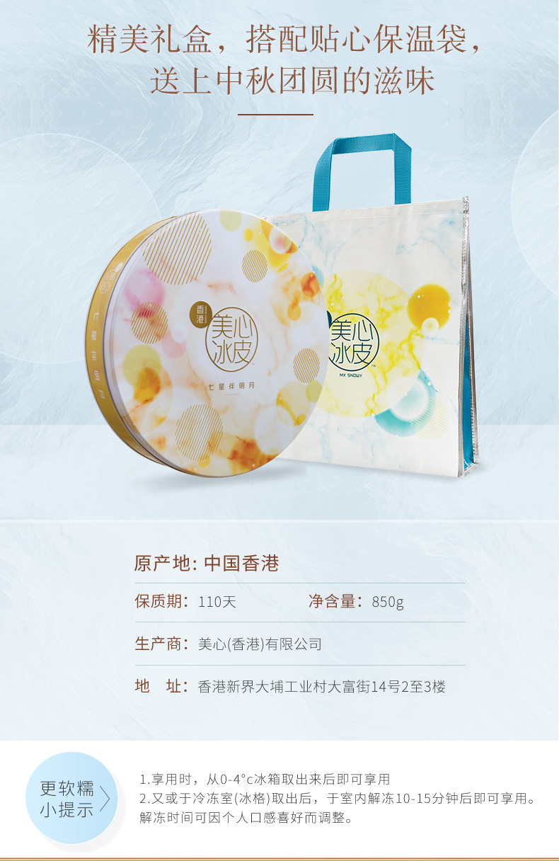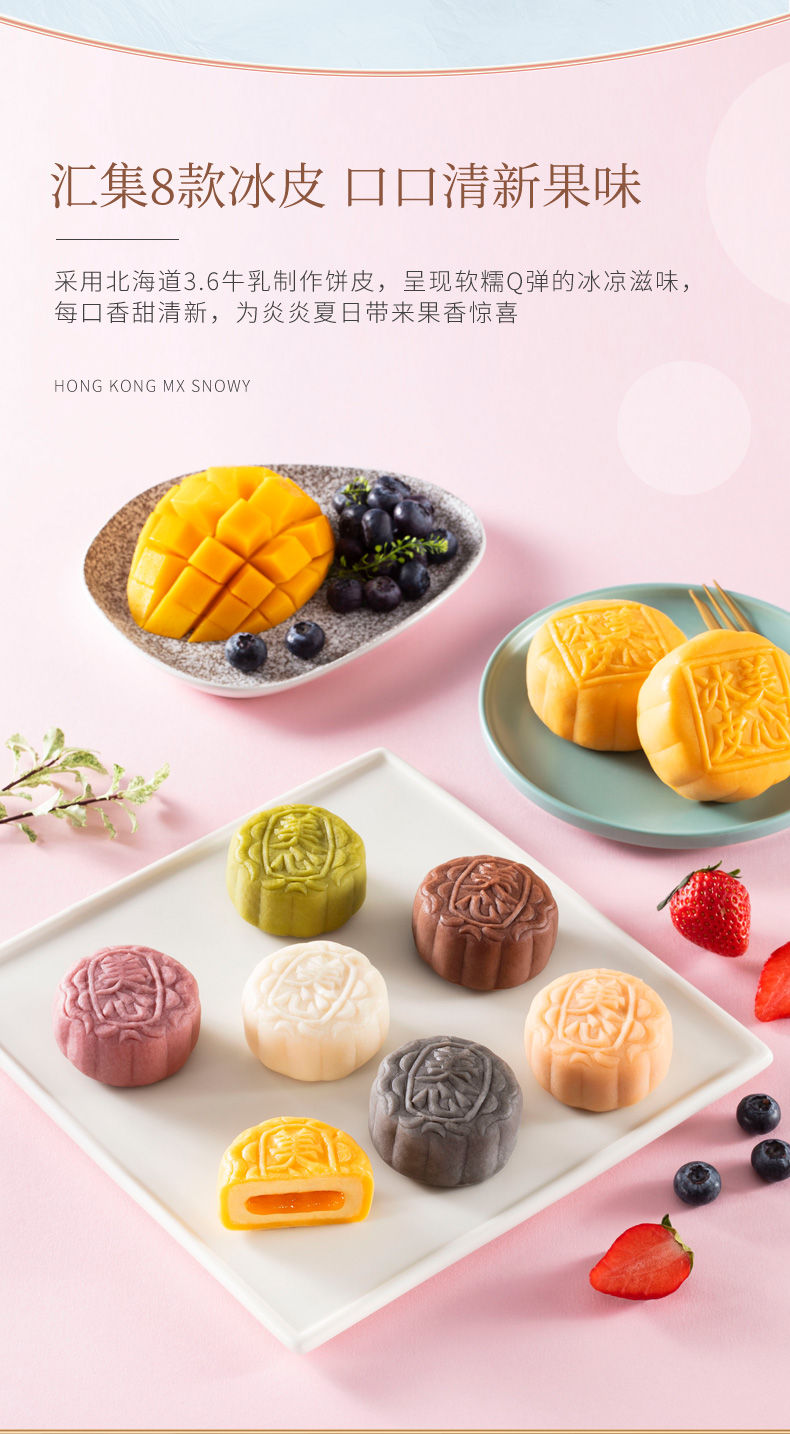 “美心”食品界的劳斯莱斯,是香港美心集团旗下的品牌,曾连续19年拿到香港月饼的销量冠军,公认好吃到爆,这款采用北海道3.6牛乳制作饼皮,呈现软糯Q弹的冰凉滋味,创新将水果蓉加入,口口清新果香,每一口都充满惊喜。