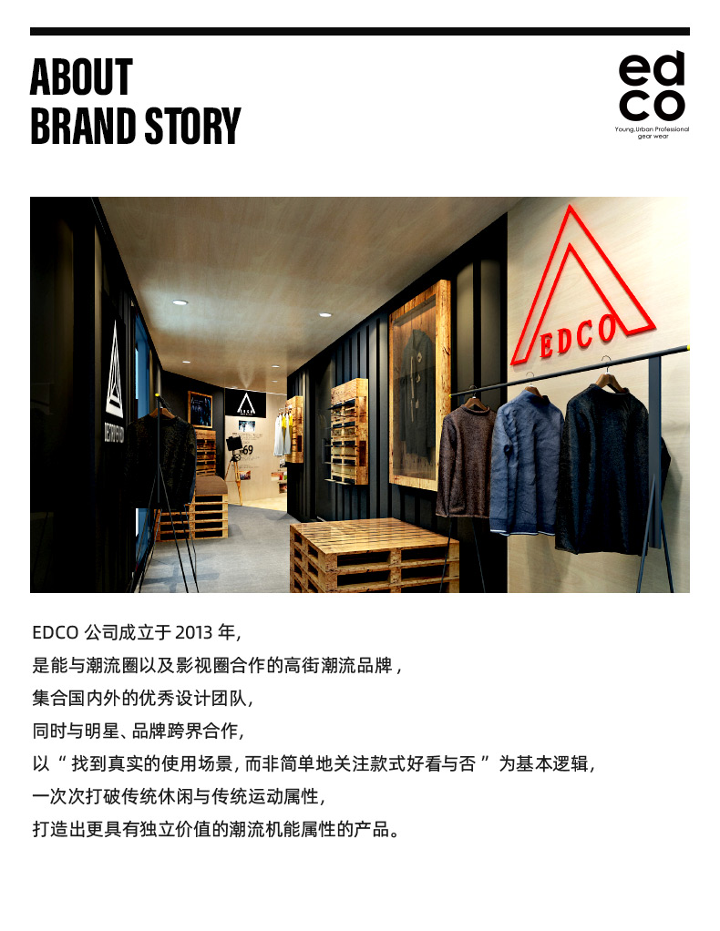 EDCO/艾德克被用户称为“小三角”,是走设计师路线的机能户外潮牌,真正原创设计,并带有户外功能性,是阿里巴巴智慧门店合作品牌,跟郑凯自有品牌DUEPLAY搞过联名,和很多国内新锐设计师也多次合作。尽管在大众人群知名度还不算高,但EDCO用户多为死忠铁粉。