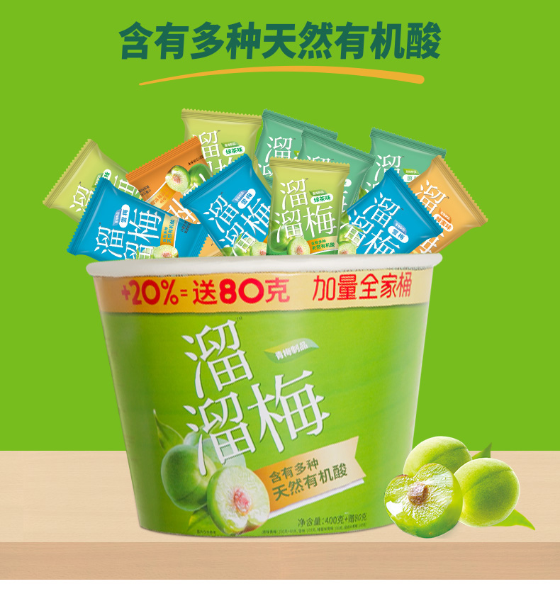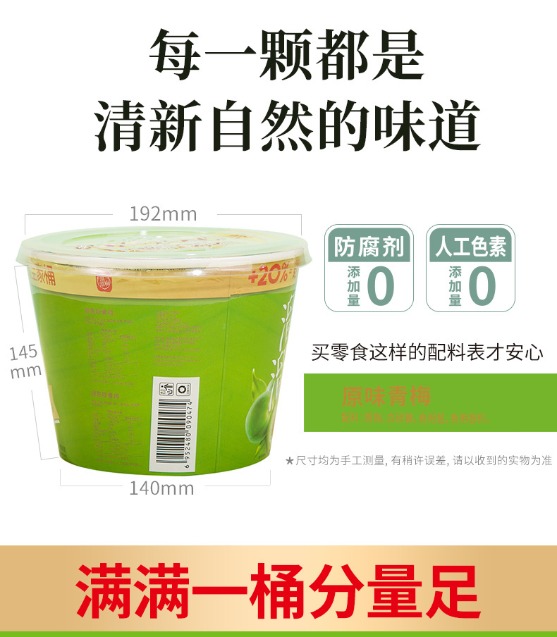 一年热销20亿颗,坚持以品质更好的A级青梅为原料,满满一桶分量足!必备零食,酸甜话梅,无防腐剂无色素,酸爽解腻,开胃助消化,大桶四种口味,休闲佳选。规格:480g。