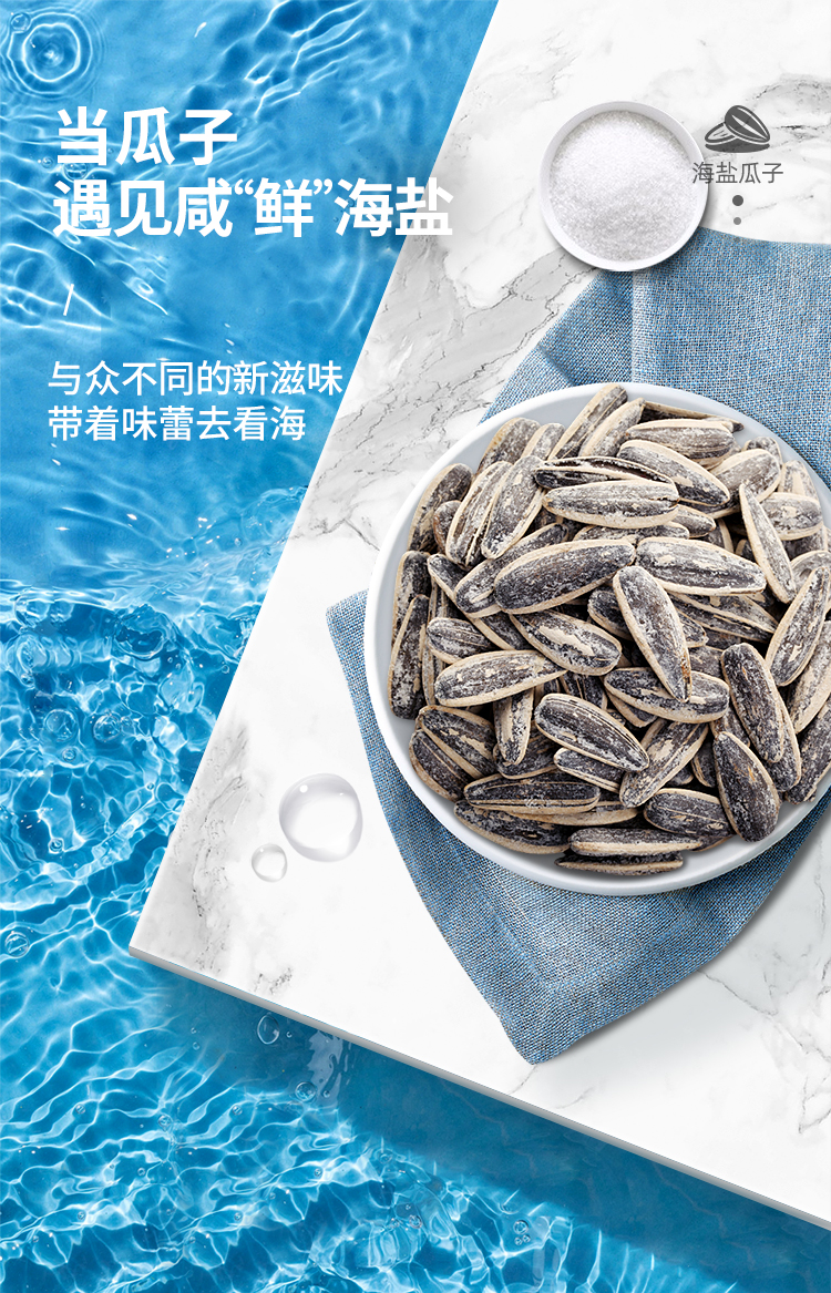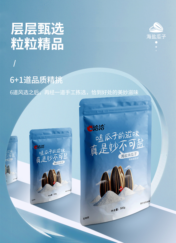 这款洽洽 清新海盐味葵花籽瓜子,6道风选,再经1道手工拣选,精选大粒饱满葵花籽,清新海盐精煮工艺加成,恋上咸“鲜”海盐味。
