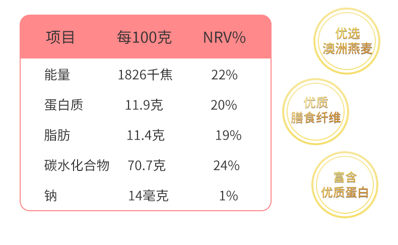 精选澳洲阳光燕麦燕麦经过精细加工,食用更加方便,口感也得到改善。富含膳食纤维和蛋白质,属于低热食品,食后易引起饱感,长期食用具有减肥功效。此外,燕麦中含有丰富的维生素B1、B2、E、叶酸等,可以改善血液循环、缓解生活工作带来的压力。