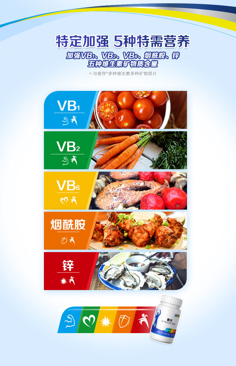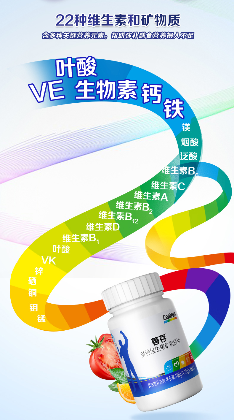 这款善存 男女 R多维复合维生素,根据中国成年男女两性营养需求定制,复合22种维生素和矿物质,帮助弥补膳食营养摄入不足,特别加强了B1、B2、B6、烟酰胺、锌五种元素,日常一粒便可满足日常所需,规格是80片/瓶、注:17岁以下、孕妇、乳母不适合。