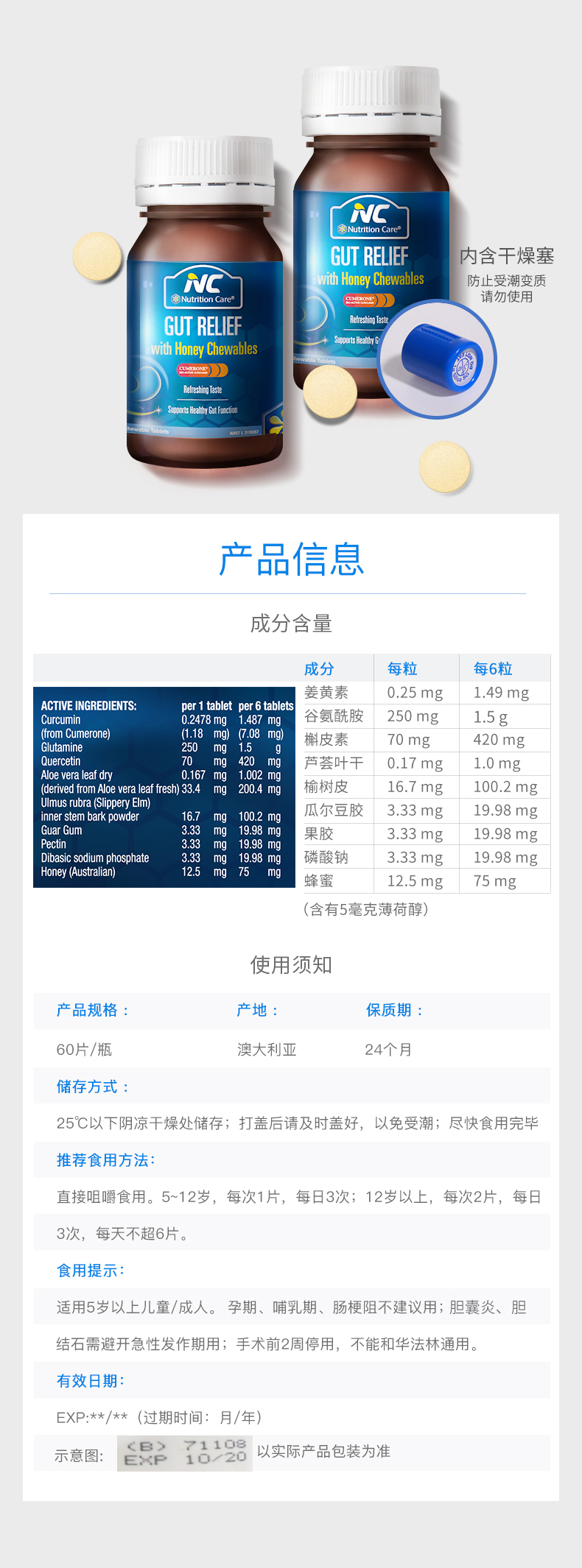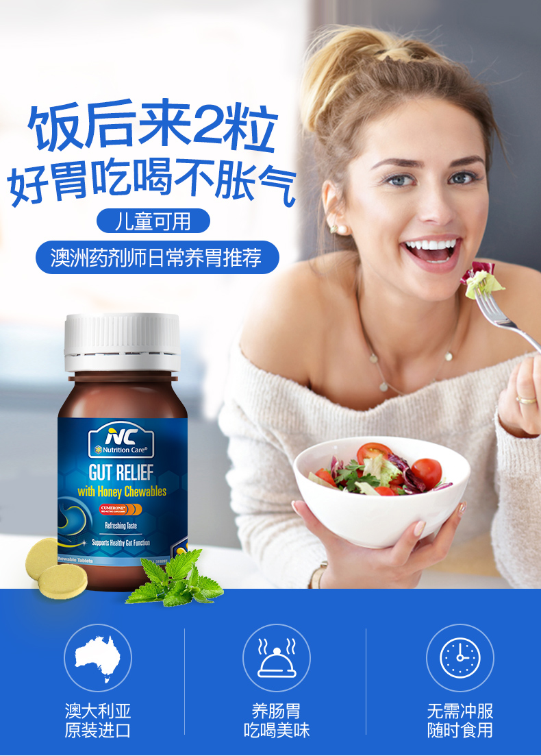 这款Nutrition Care 蜂蜜养胃咀嚼片,澳大利亚原产,能有效抑制幽门螺杆菌、缓解肠胃不适、调理肠胃健康、预防HP感染。适用于慢性胃炎、肠炎,便秘腹泻,腹胀腹痛等。帮助修复肠胃粘膜,功效比一般产品要好。