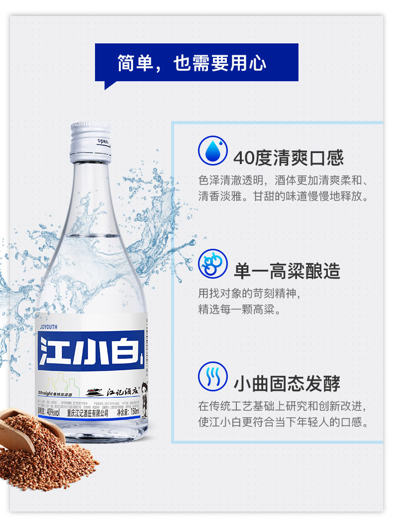 江小白,相信大家没喝过也听过,一种自然发酵并蒸馏的高粱酒品牌,每一瓶内部都有一条鸡汤语录,非常有意思,让中国白酒告别了一直追求“历史文化”的营销理念,外观新颖,口感不错,是年轻人喜欢的品牌。