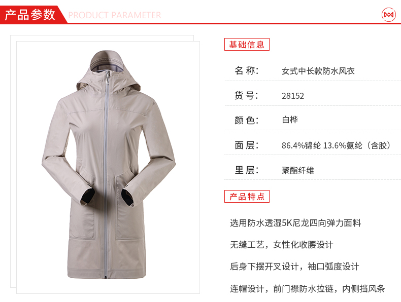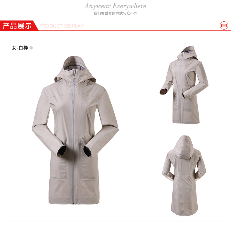 在款式上,中长款设计,加上立体收腰版型,女生上身效果非常好;整件衣服都是用无缝工艺制成的,最大程度的减少拼接,防护性更好同时也会大大增加成本。一体连帽设计,加长帽檐可以更好的引导雨水随意滚落;