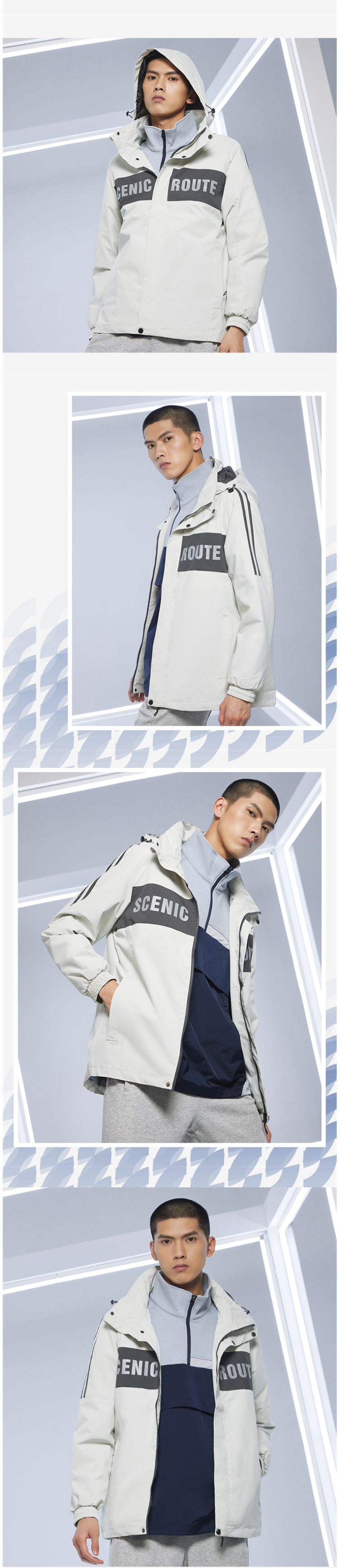 在款式上,合身版型,经典运动风衣款设计,加大加宽的头盔式防风帽,搭配半高领,能很好的防风不漏风,双重门襟,两侧插袋有拉链,置物安全,弹力袖口。