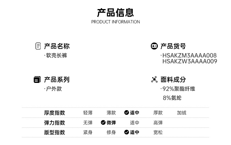 面料方面:海澜之家这款软壳裤是外层是100D厚度、92%聚酯混8%氨纶面料,面料耐磨好、防泼水、带有适度的弹力;裤子里层带薄绒。层面料和里面抓绒层之间,带有防风贴膜,防风效果好,能有效避免风寒效应。