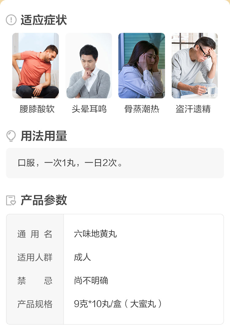同仁堂六味地黄丸是多年做药品的老品牌了,产品质量可以保证。这款六味地黄丸大蜜丸,主治肾阴亏损、腰膝酸软、骨蒸潮热、盗汗遗精以及头晕耳鸣等肾虚症状。规格:9g*10丸/盒。