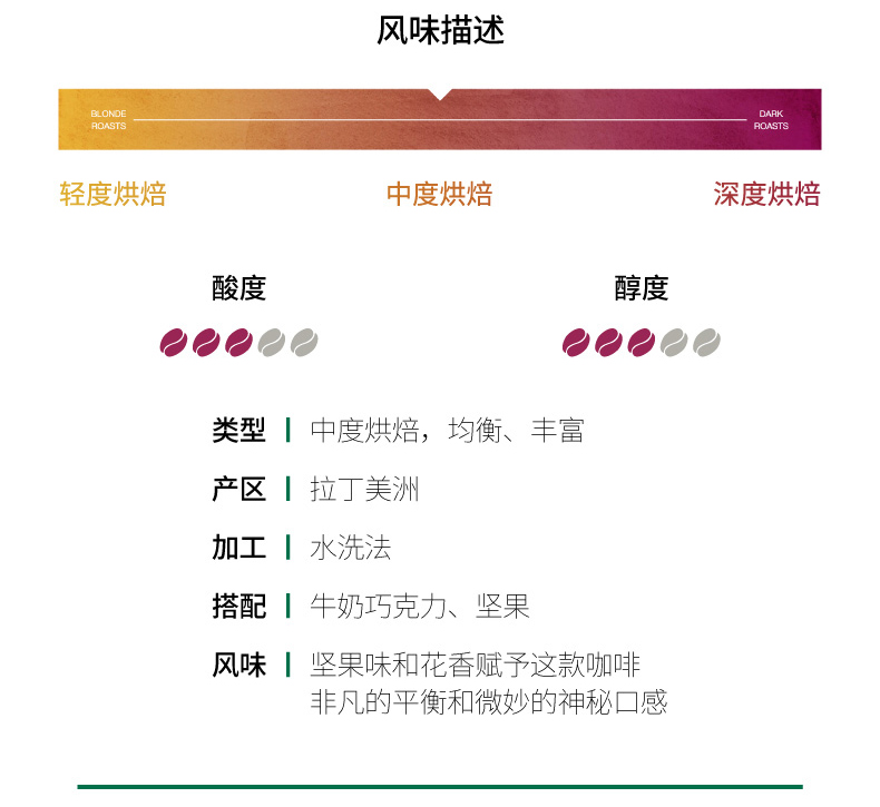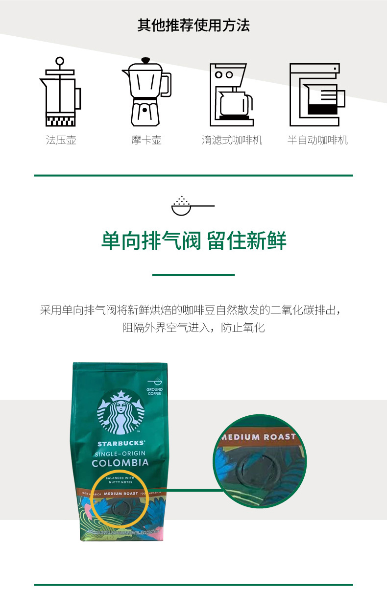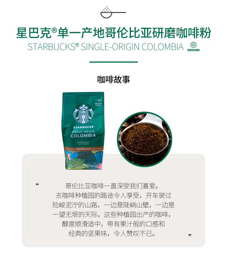 这款星巴克单一产地哥伦比亚研磨咖啡粉,美国原装进口,采用拉丁美洲的优质咖啡豆,搭配牛奶巧克力、坚果等辅料,经过长时间低温中度烘焙而成,充分释放出咖啡独有的香味,口感浓郁,适合用水洗法加工。
