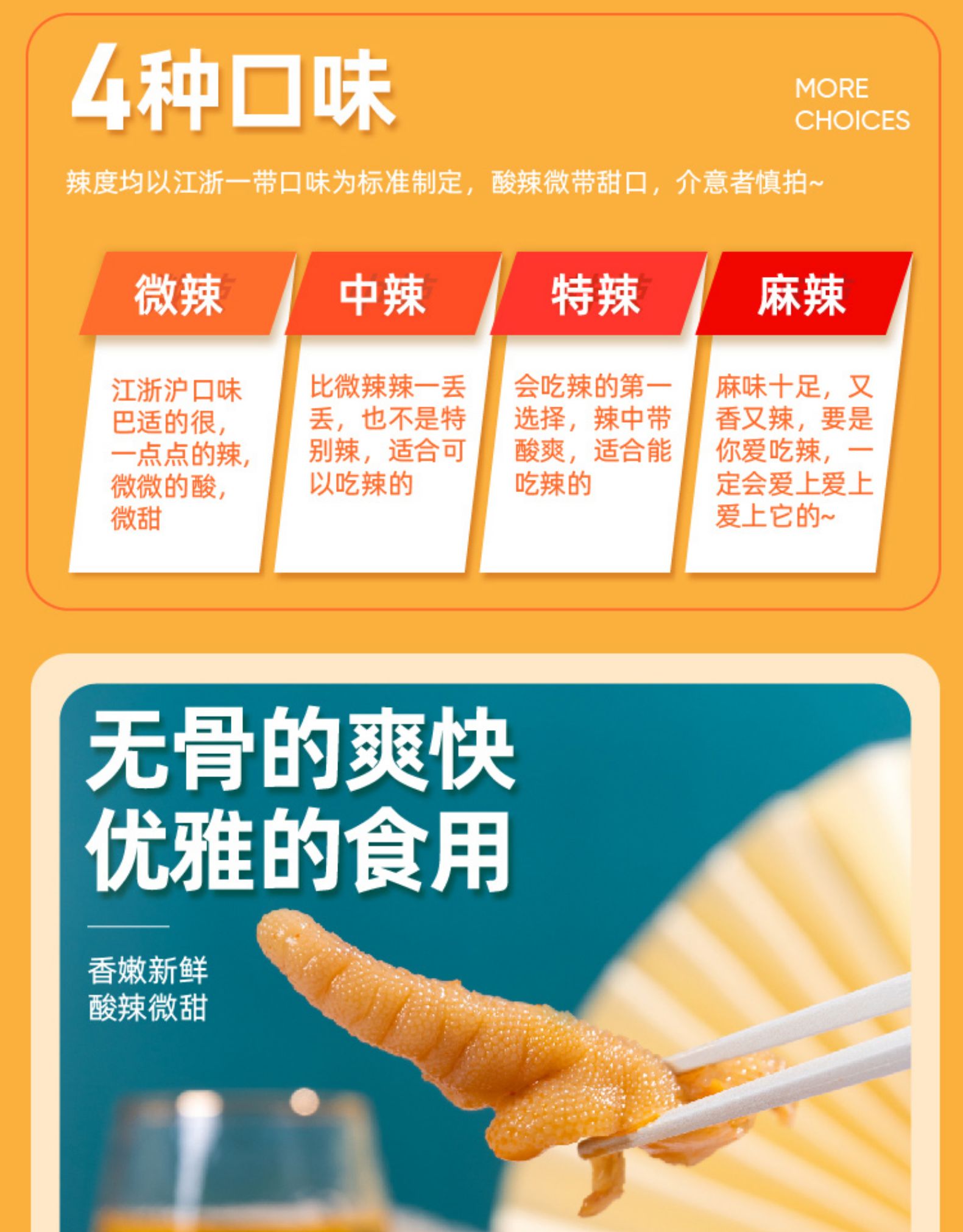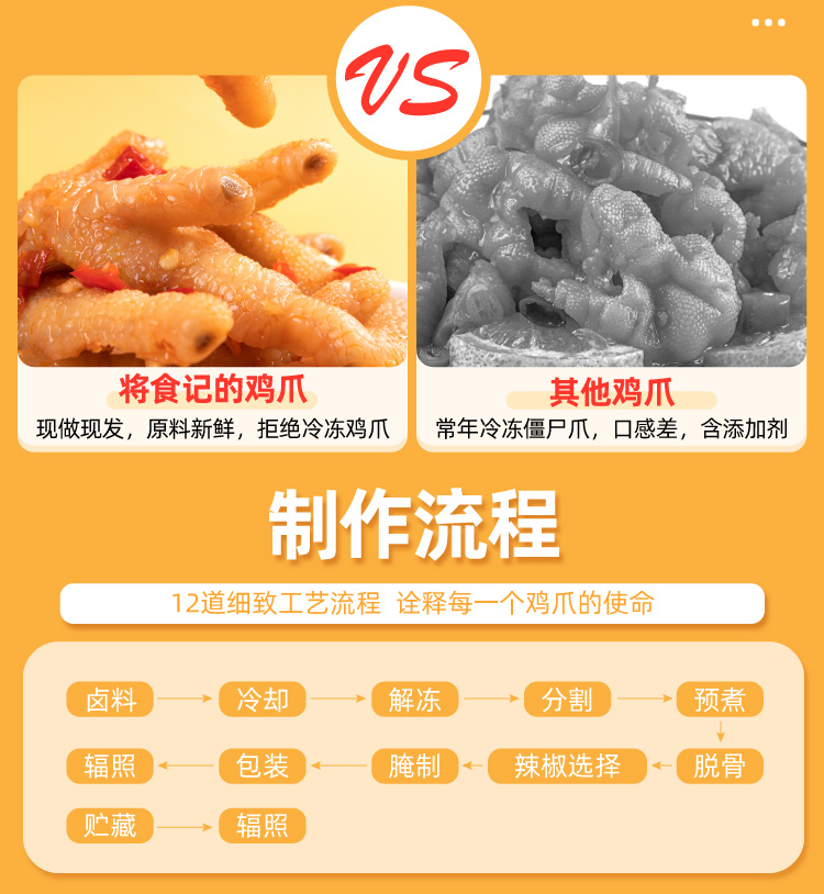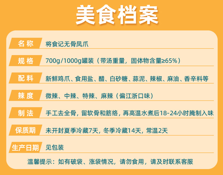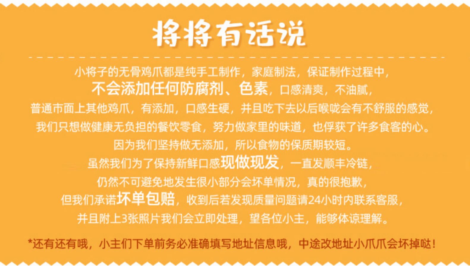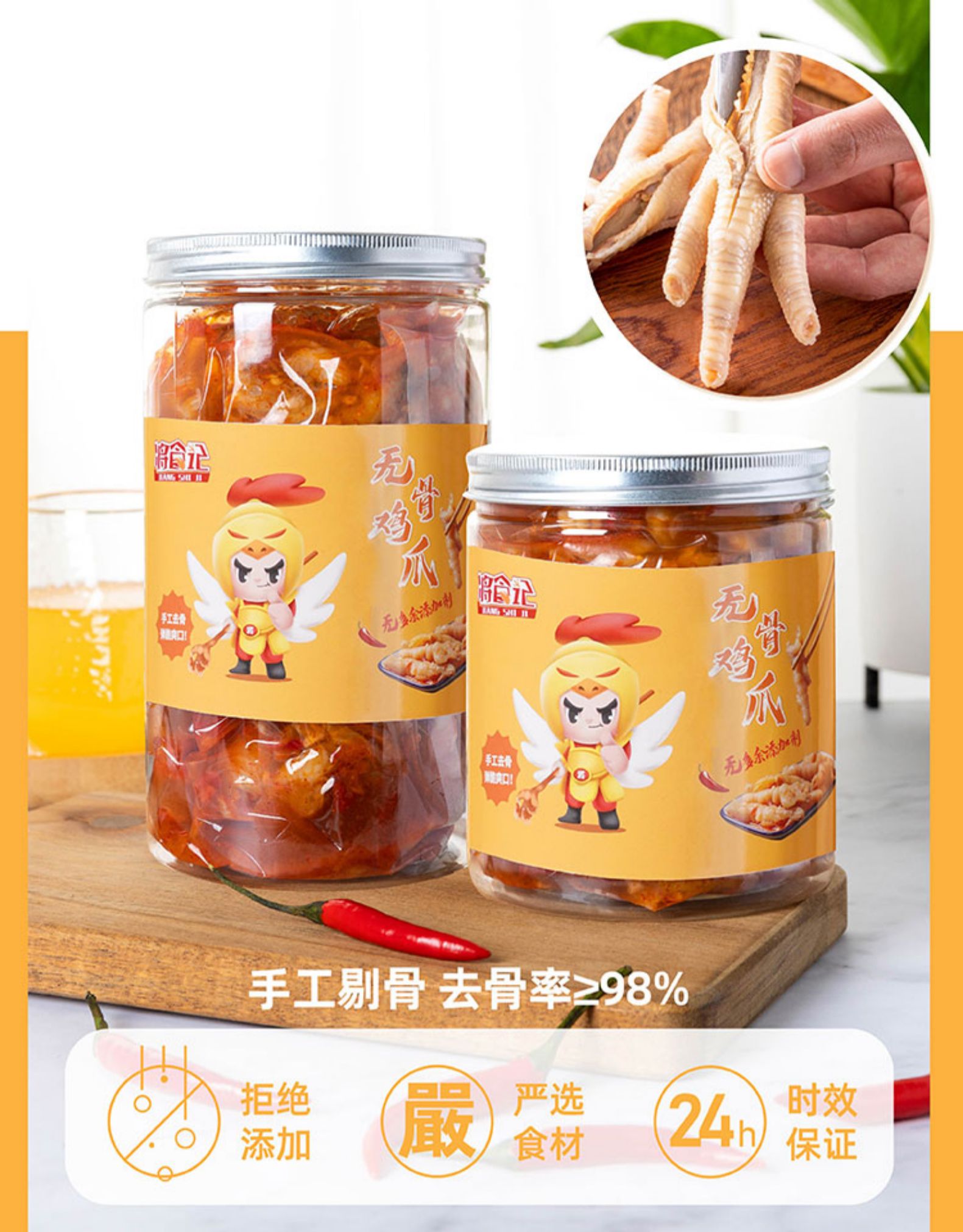 天猫将食记旗舰店49元,可领10元优惠券,实付39元到手,500g装此价,下单顺丰包邮,微辣、中辣、麻辣、特辣4种口味可选。手工去骨的无骨鸡爪,剔骨率98%以上,固形物含量65%以上,无防腐剂添加,配料均为常见调味料,保留软骨和筋络,未开封冷藏夏季保质7天、冬季保质14天,常温2天。