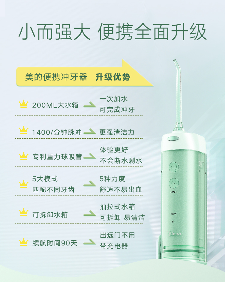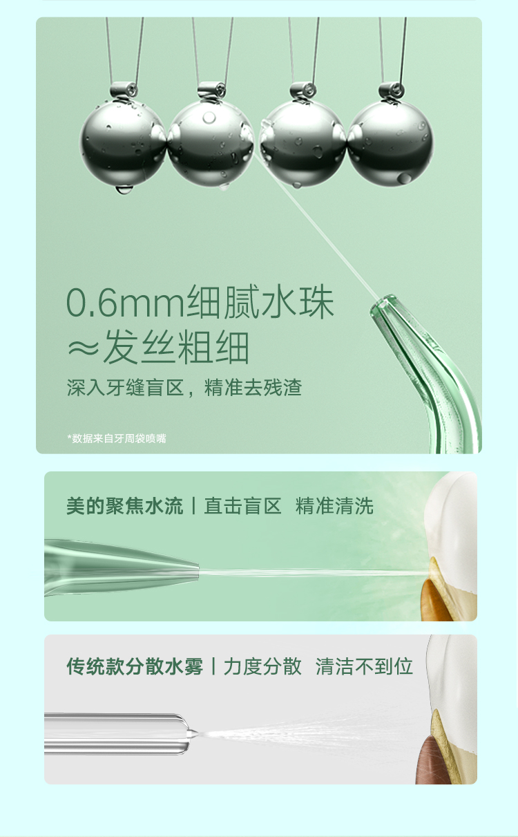 1400次/min高频脉冲,0.6mm细腻水珠,聚焦水流全方位清洁死角死缝,有5种清洁模式,在搭配4种喷嘴,适合不同人群打造专属你的清洁方案。