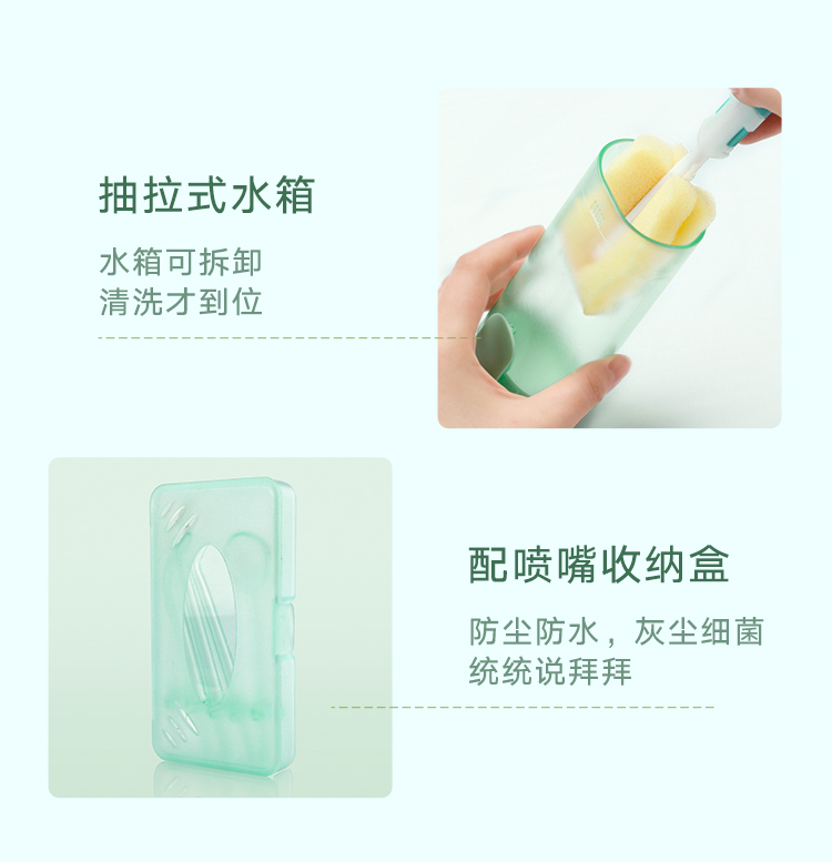 200ml容量可伸缩式水箱,随意变换大小,收纳更便携。水箱可拆卸方便日常清洗,不易滋生细菌。喷嘴随意旋转清洁口腔无死角,360°保护您的口腔健康。