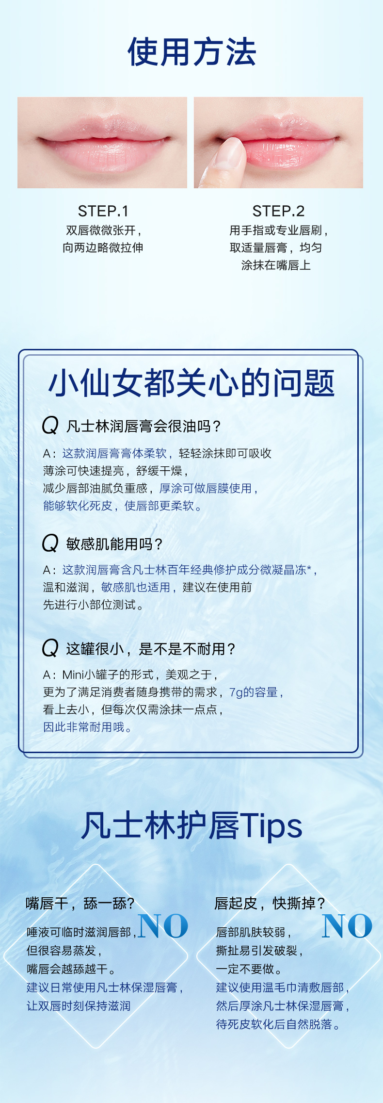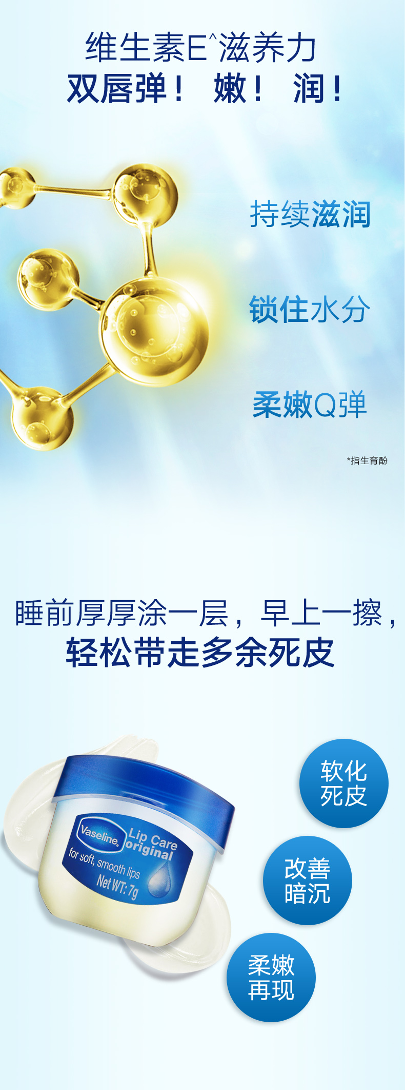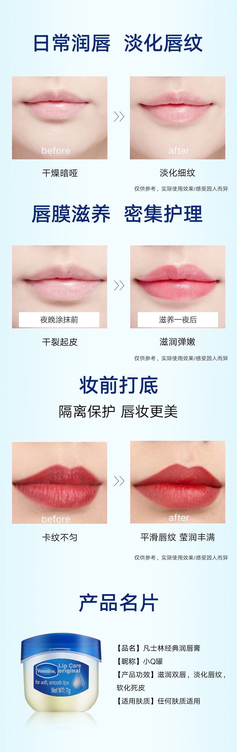 这款Vaseline 凡士林 润唇膏,是凡士林的经典修护系列,蕴含微凝晶冻,滋润双唇,透明无色,稍带润色效果,白天使用维持唇部滋润不干燥,晚上还可以用作唇膜,修复干燥、起皮的状况,使唇部状态好转。