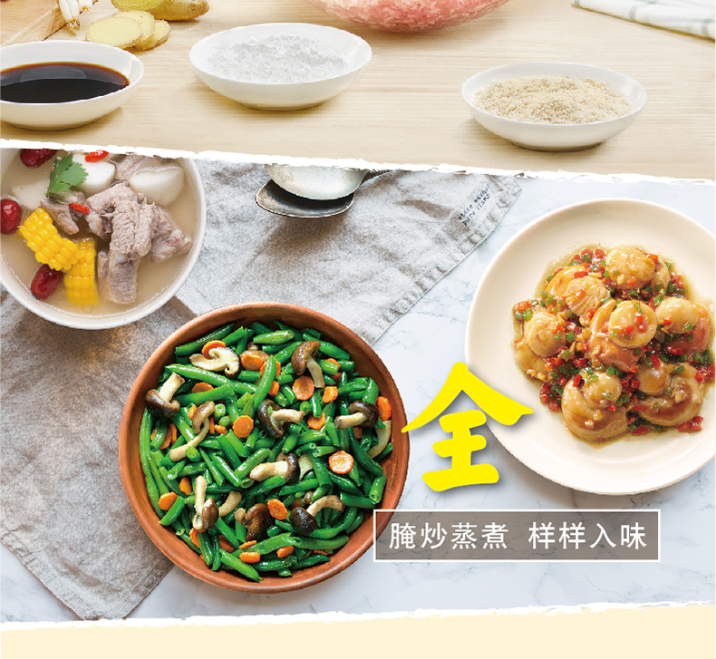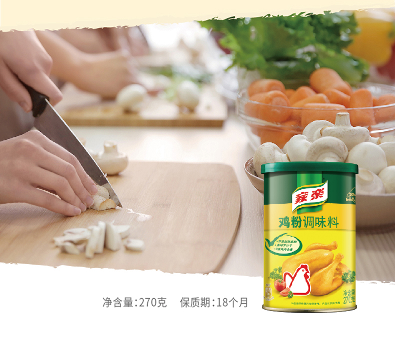 这款家乐鸡粉使用真正鸡肉制作,鸡肉含量是鸡精的3倍,能提供醇正的鸡鲜味,通过汤冻专利技术和精细造粒技术制作,融化快,冷水也易溶,腌制生鲜也不在话下。规格为270g*2罐。