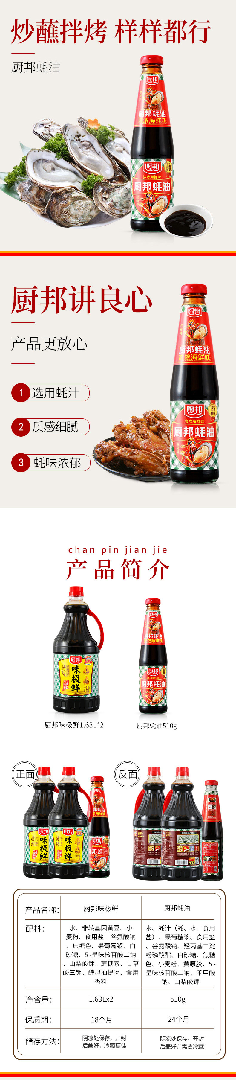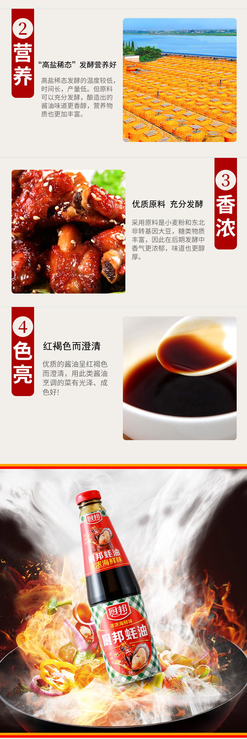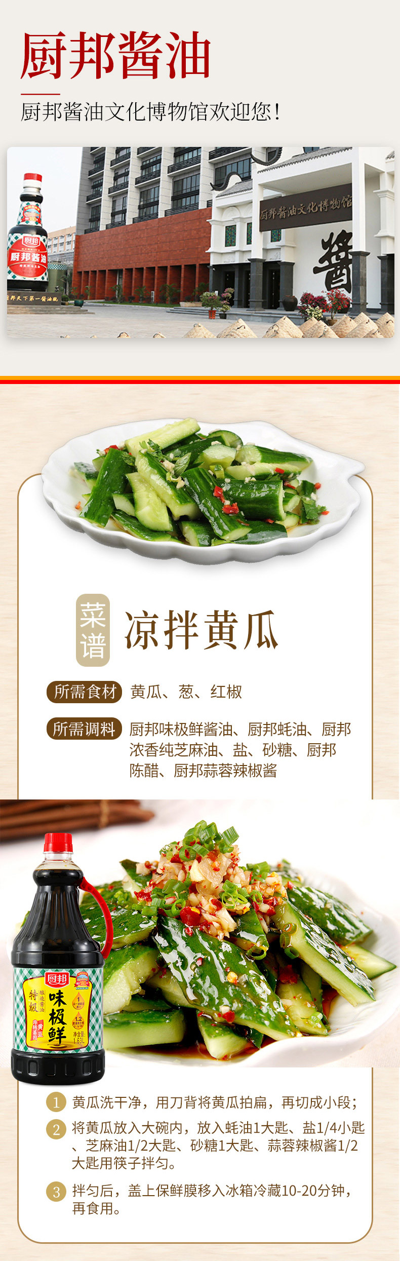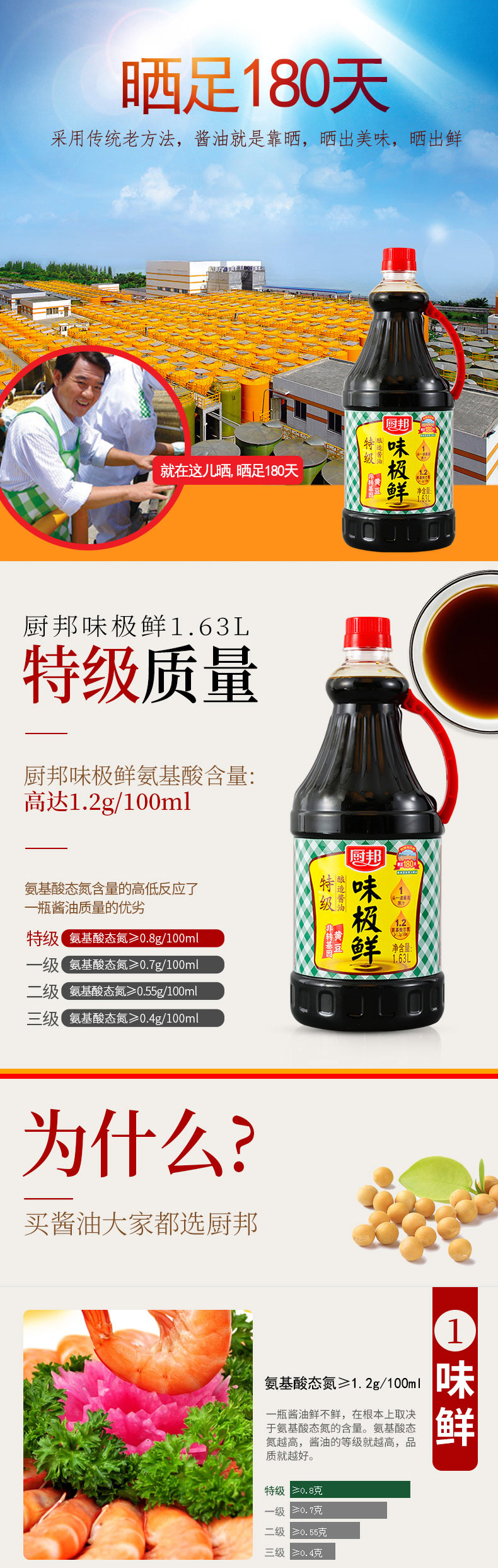 厨邦国内著名调味品品牌。此款为厨邦味极鲜特级酿造酱油,晒足180天,传承南派酱油工艺精髓,氨基酸态氮含量高达1.2g/100ml。酱油味鲜,营养,香浓,红褐色而澄清,可用于炒菜,蘸料,凉拌等。