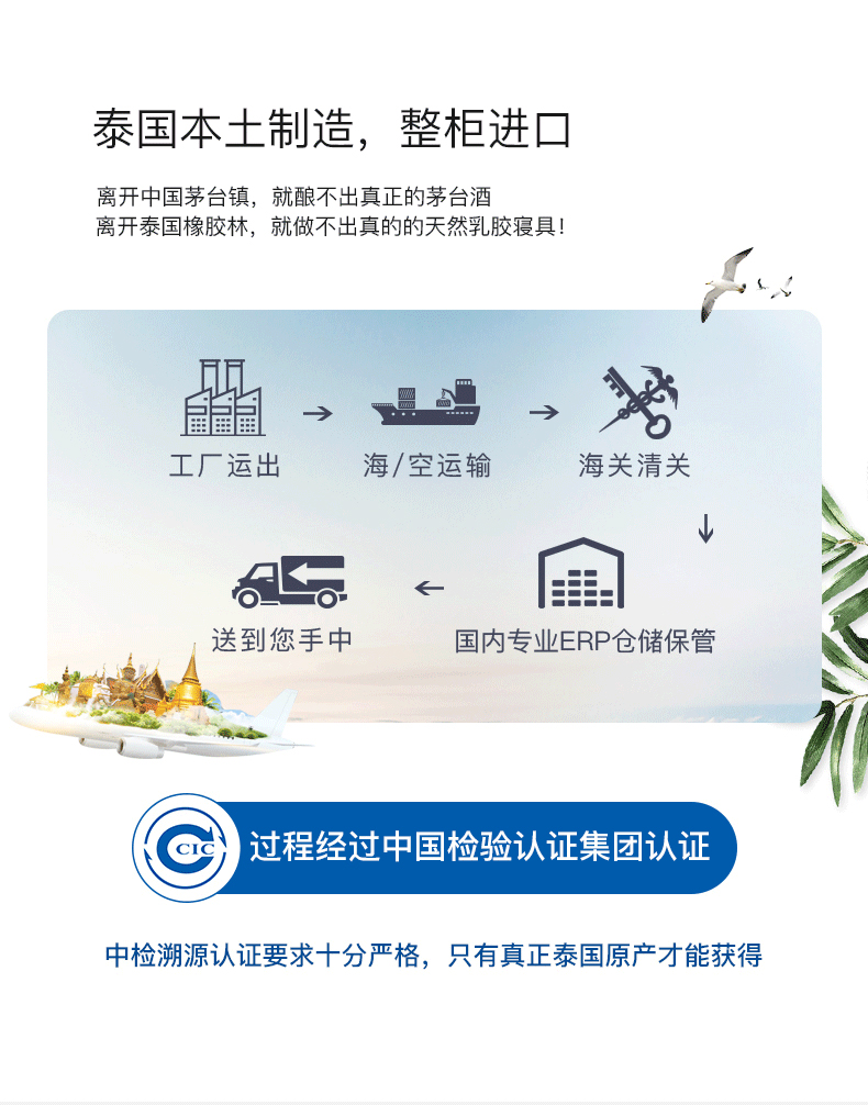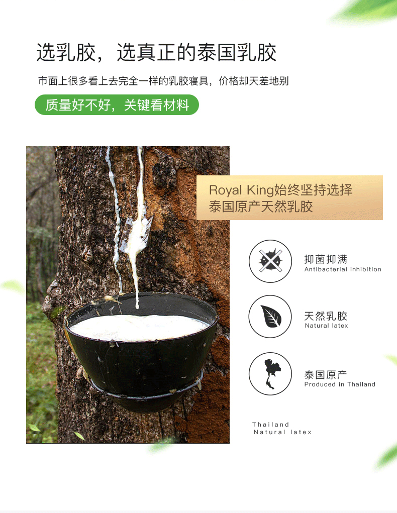 泰国原装进口 中检溯源权威认证。royalking是多次推荐过的老品牌了,经过中国检验集团原产地溯源认证,泰国原装进口,从乳胶滴下来到枕头做出来全程可追溯。20年以上乳胶树汁,胶质饱满,现采现做,不添加任何添加剂。