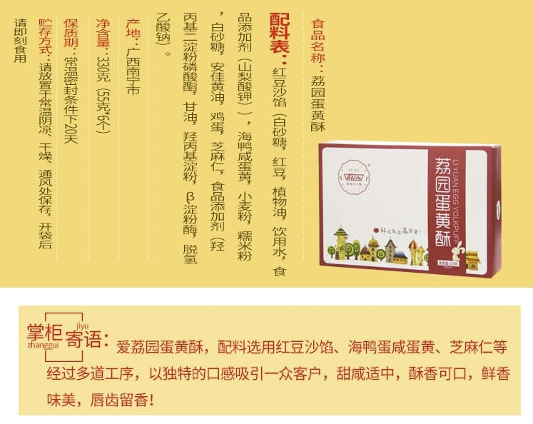 南宁荔园食品厂,是上世纪1960年发展起来的国有老企业。这款荔园红豆沙蛋黄酥,精选优质面粉,绵甜红豆沙、新鲜感海鸭蛋,采用传统工艺烘焙制作而成,甜中带咸,口感细腻;独立小包装,干净卫生。