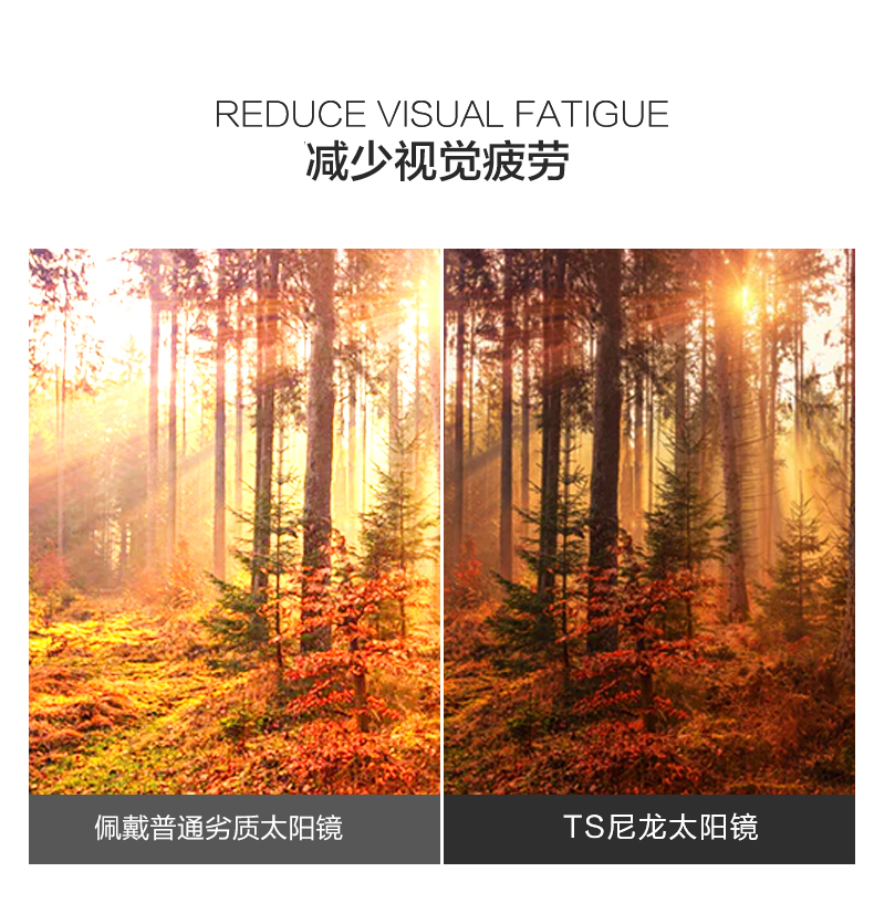 镜架采用304H不锈钢材质,具有优秀的抗汗腐蚀性、耐高温性和抗拉性,且硬度高、重量轻;尼龙偏光镜片,清晰度高,能真实高还原色彩,还能有效防紫外线、防眩光,减少视觉疲劳度,钓鱼、开车、时尚搭配都没问题。