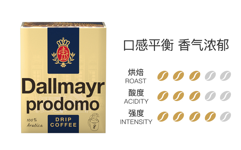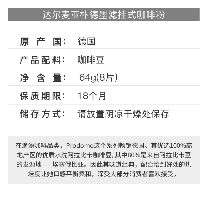 这款Dallmayr 达尔麦亚 Prodomo 滤挂式咖啡粉 64g*8片,优选100%高地产区的优质水洗阿拉比卡咖啡豆,其中80%是来自阿拉比卡豆的发源地——埃塞俄比亚。 因此其味道经典,配合恰到好处的烘培度让口感平衡柔和。