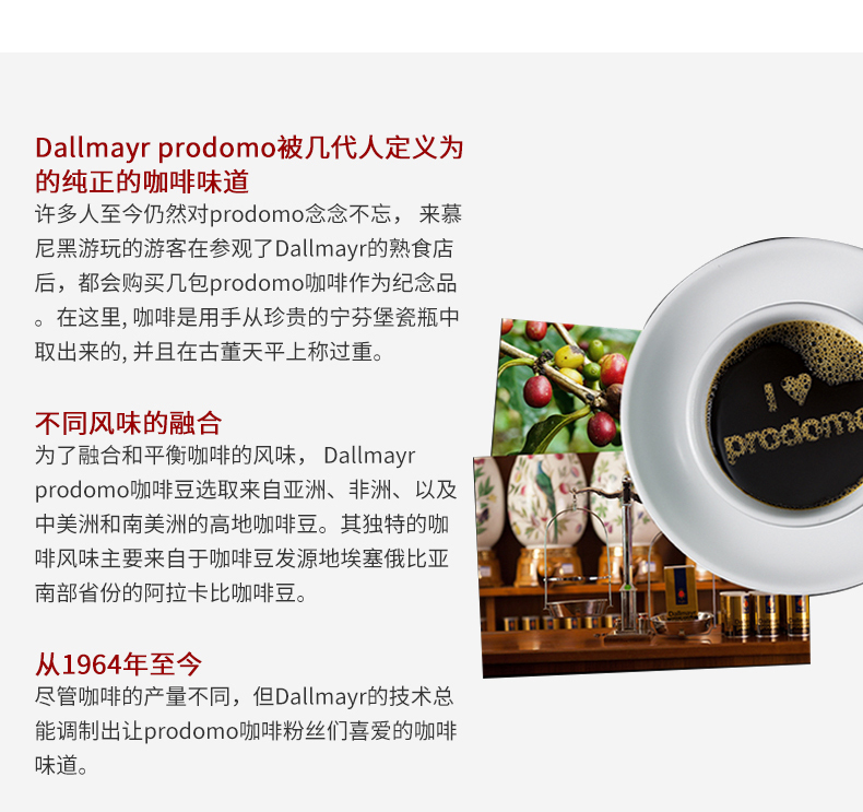 Dallmayr的名字代表了卓越的产品品质和服务质量,其传统可以追溯到300多年前,因受到拜尔王室的喜爱而闻名,是德国知名的咖啡品牌之一。其独特的Prodomo咖啡在全球享有盛誉。Dallmayr prodomo被几代人定义为的纯正的咖啡味道许多人至今仍然对prodomo念念不忘,来慕尼黑游玩的游客在参观了Dallmayr的熟食店后,都会购买几包prodomo咖啡作为纪念品。在这里,咖啡是用手从珍贵的宁芬堡瓷瓶中取出来的,并且在古董天平上称过重。