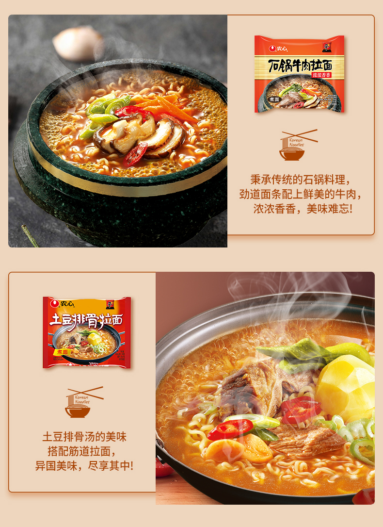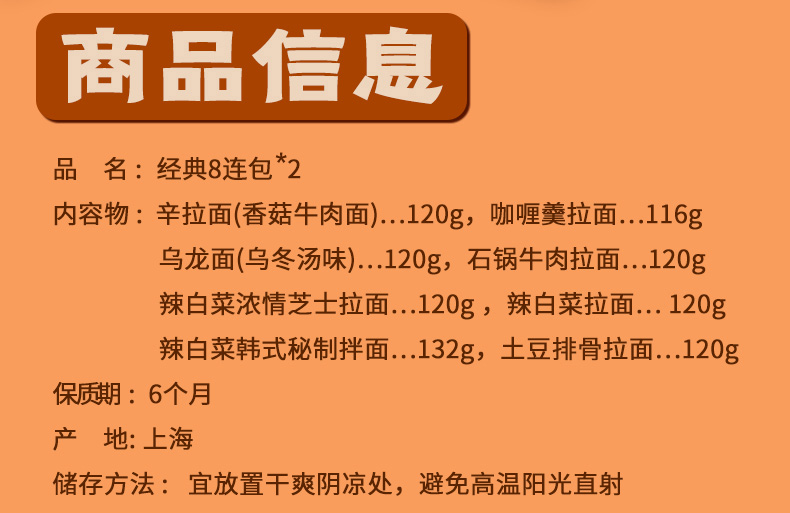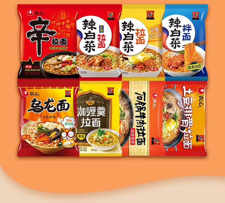 全部都是辛拉面的经典口味,单袋包含辛拉面、乌龙面、辣白菜芝士拉面、辣白菜秘制拌面、咖喱羹拉面、石锅牛肉拉面、辣白菜拉面和土豆排骨拉面,农心的方便面口味都不错,而且比较清淡,不腻。