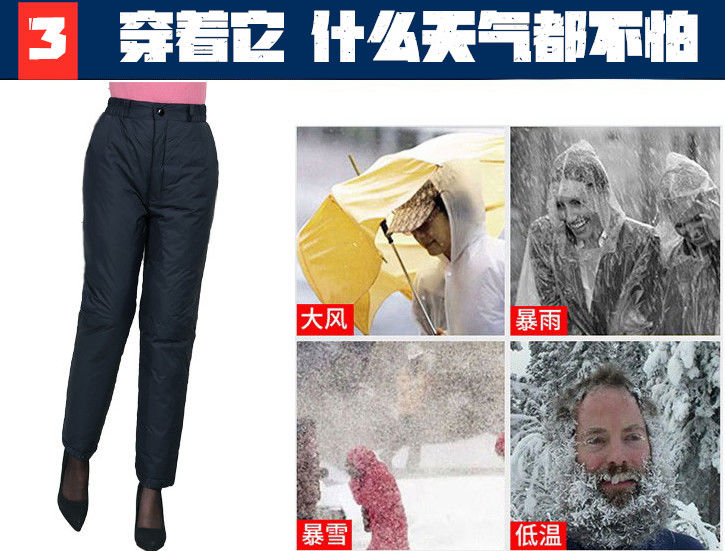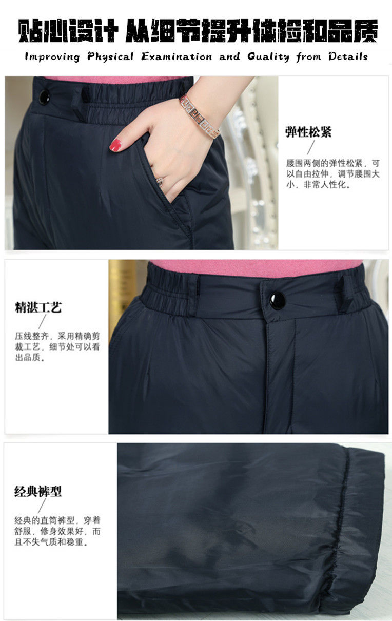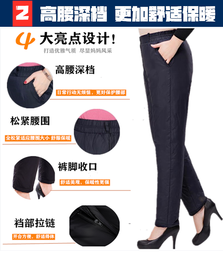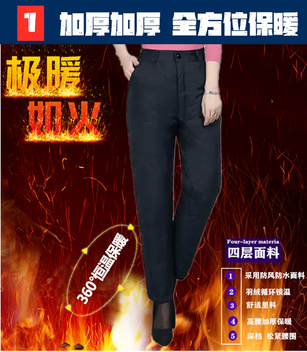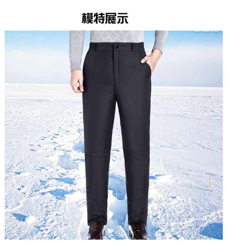 这款羽绒裤,采用更高密度的防风防泼水面料,内里填充优质90白鸭绒,四层锁绒设计,告别钻绒的烦恼,合体版型,高腰深档,穿着舒适,秋冬季可直接单穿,保暖不臃肿。
