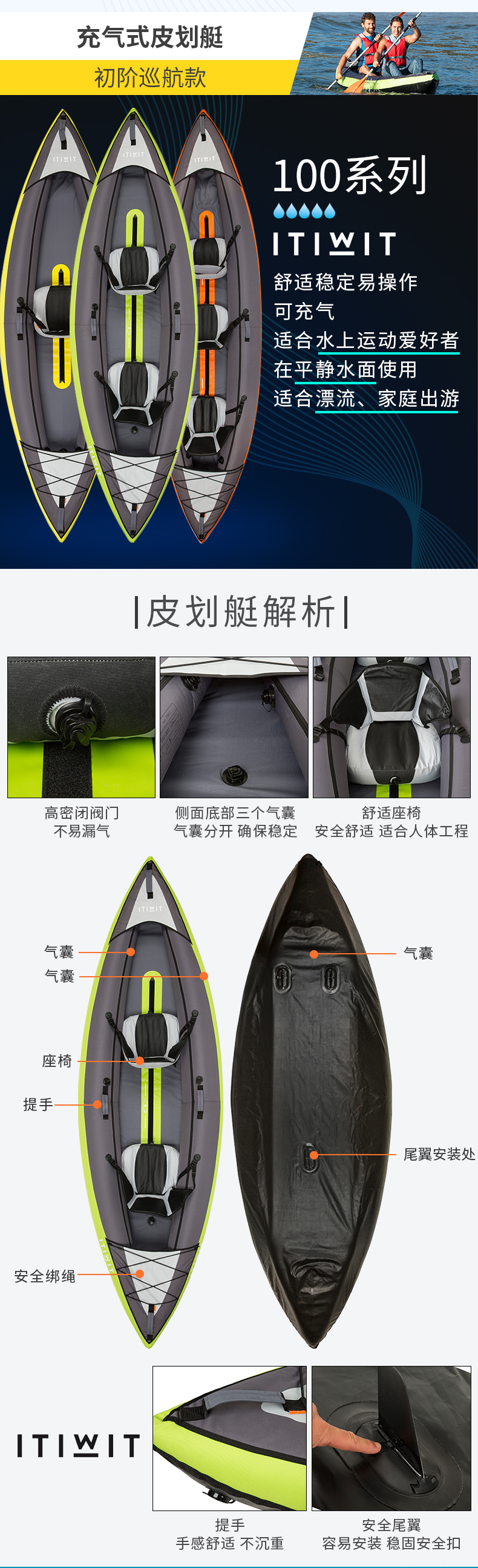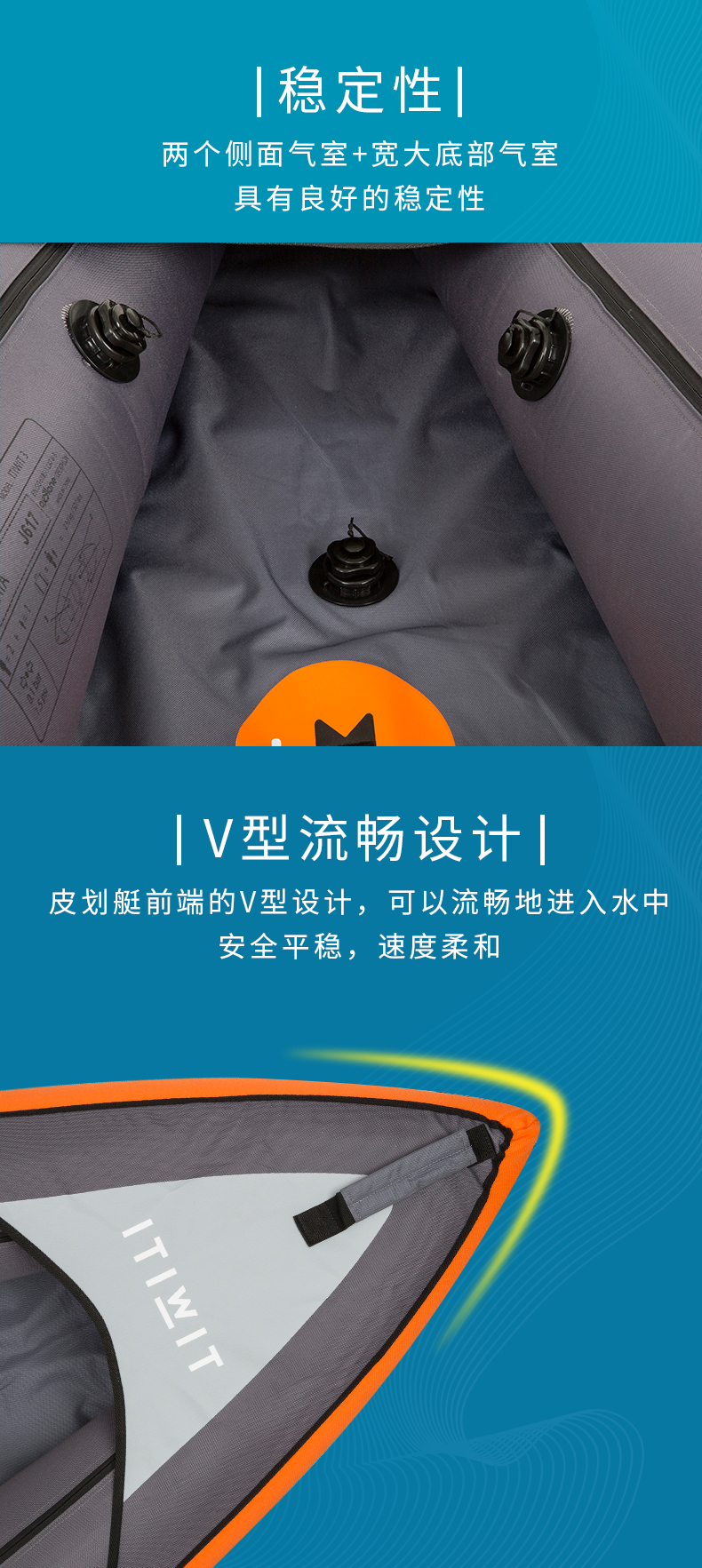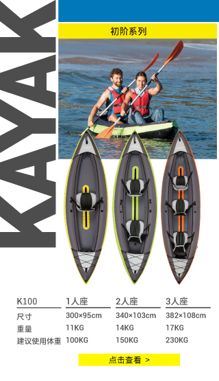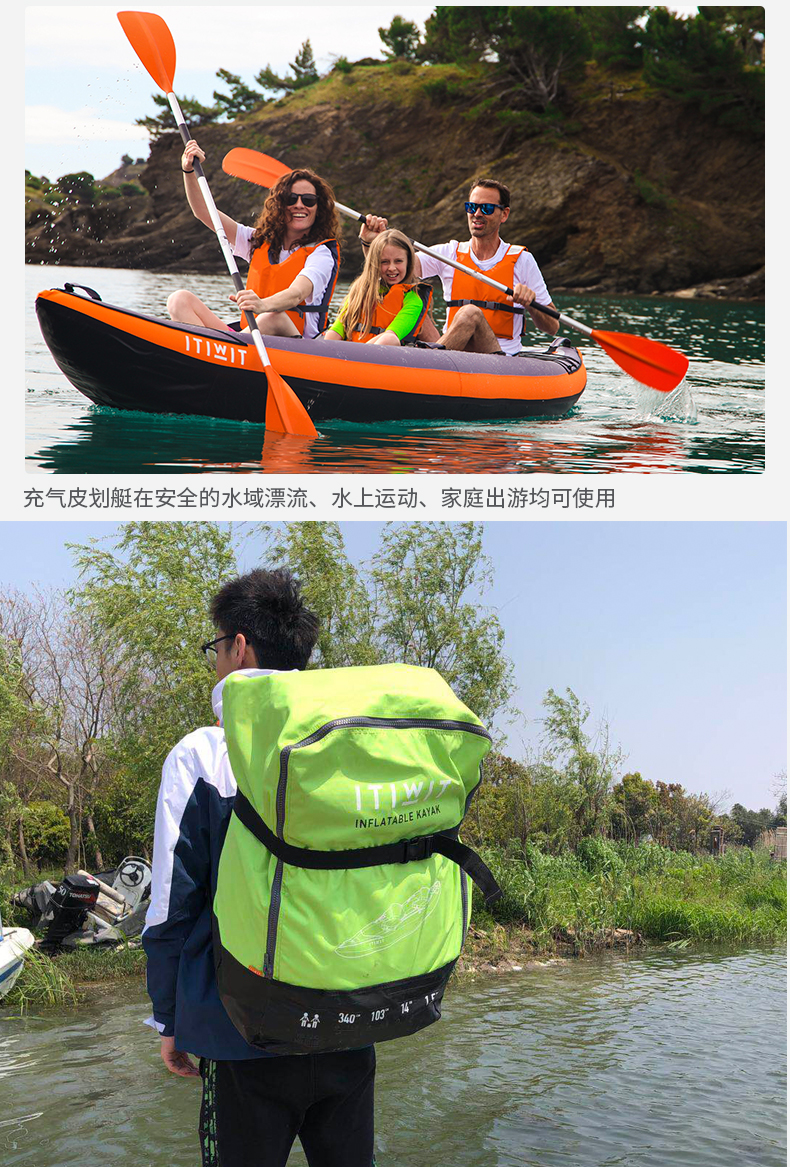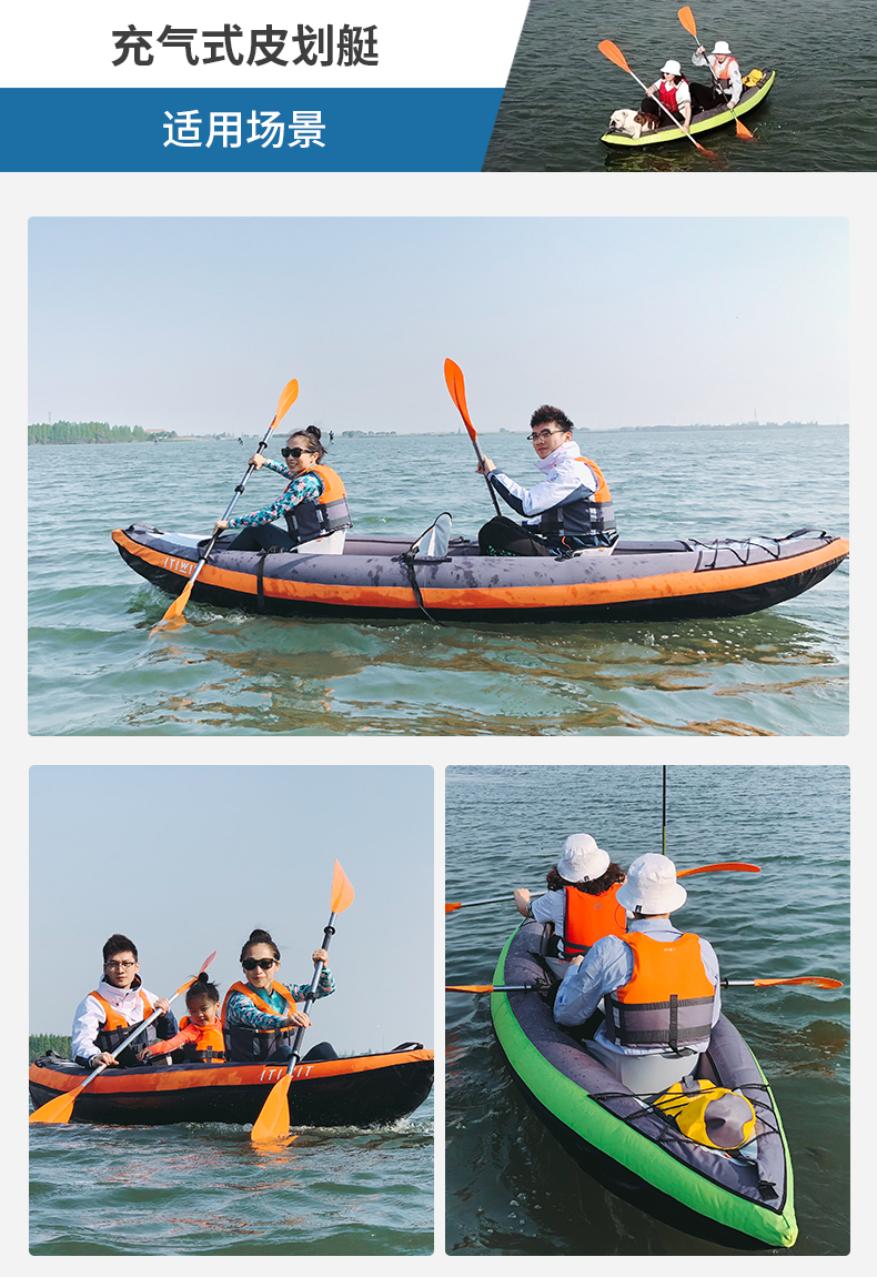 此款充气式皮划艇可根据座位数量选购,舒适稳定易操作,适合水上运动爱好者在平静水面使用,适合漂流、家庭出游、单人出游。