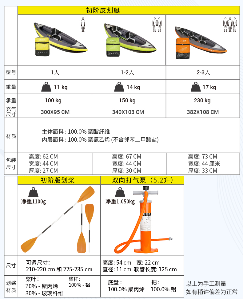 这款皮划艇属于巡航款的初阶系列,单人座皮划艇可承重100kg,尺寸为300*95cm,主体面料为聚酯纤维,内层面料为聚氯乙烯,不含邻苯二甲酸盐。皮划艇侧边有高密闭阀门,不易漏气,座椅舒适,适合人体工程。