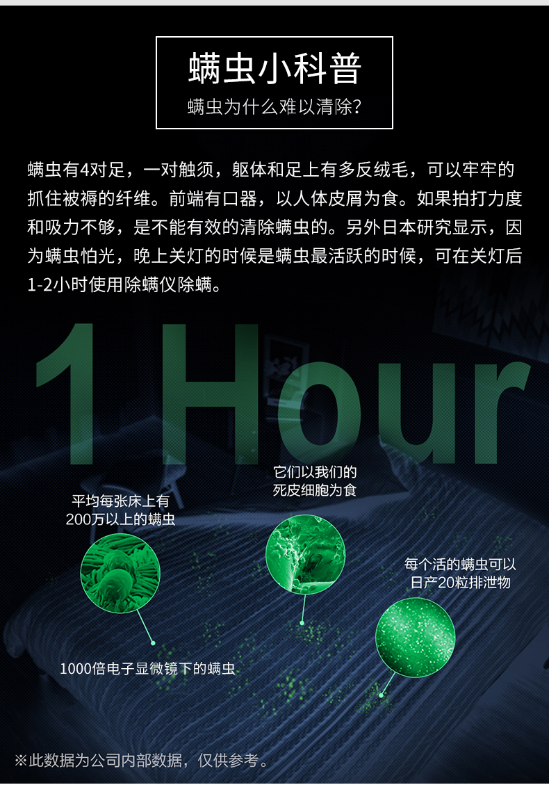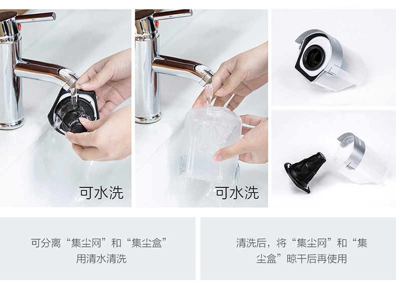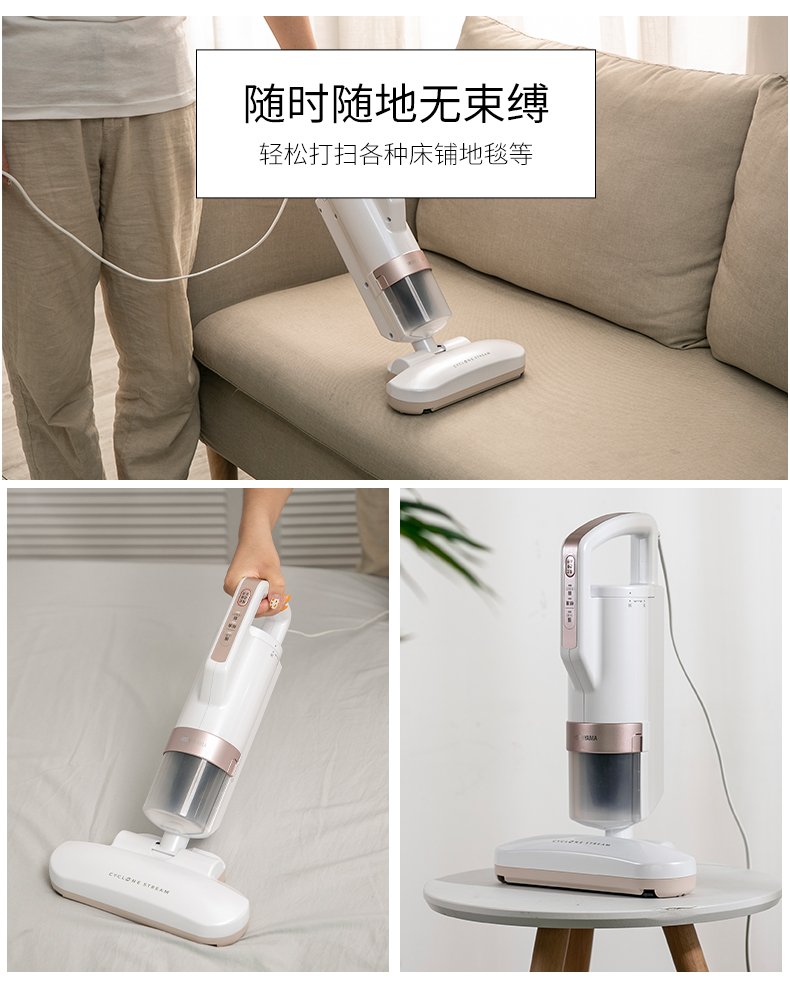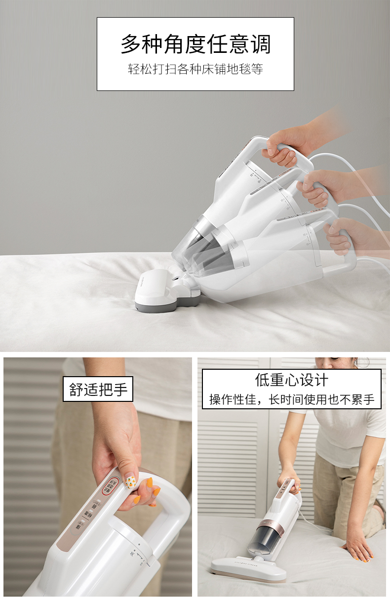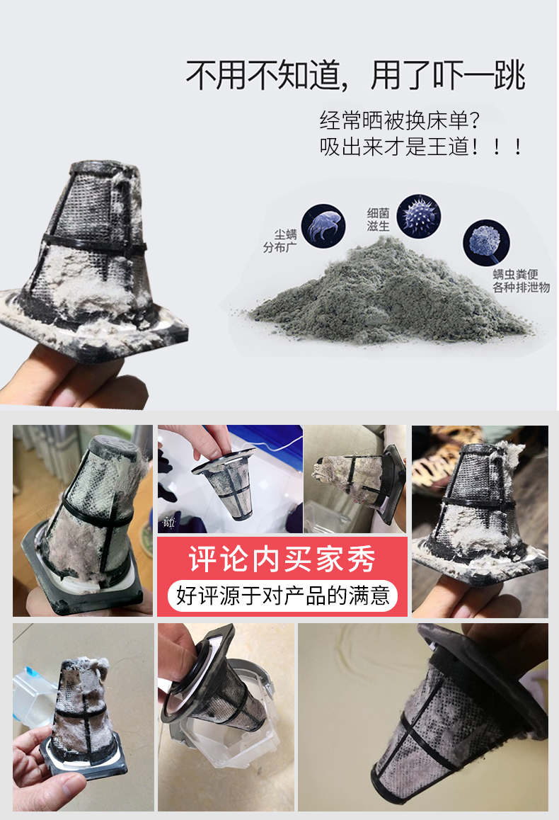 强力吸尘:把被褥中的灰尘和螨虫吸出来,进入到集成滤网和尘盒中,可直接拆洗,减少后期耗材成本;