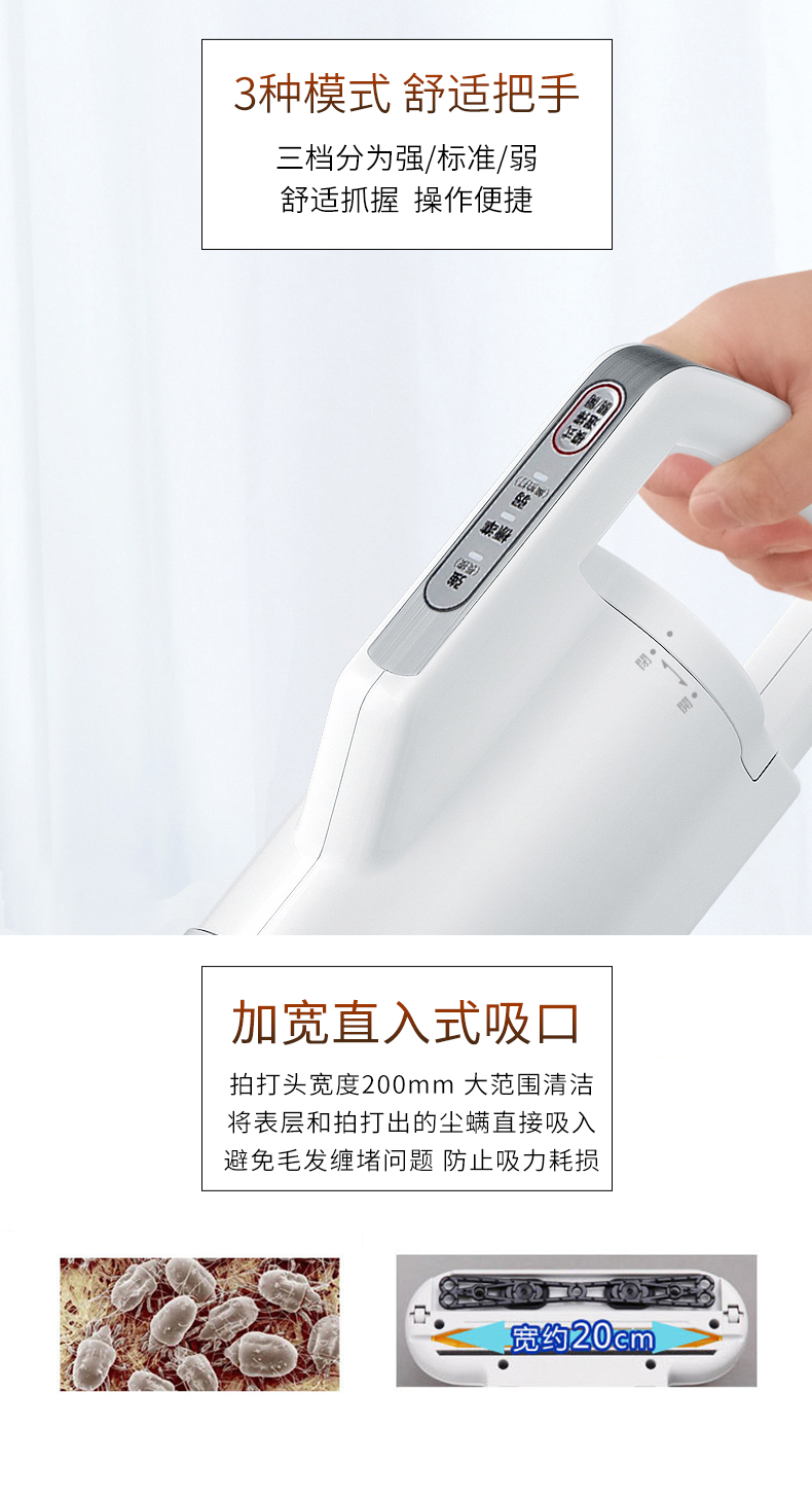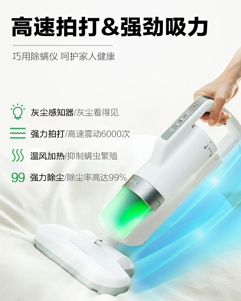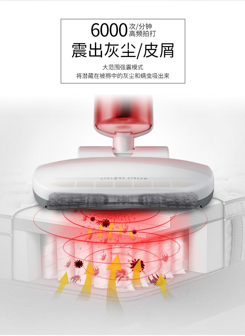 高频拍打:6000次/分的高频拍打,大范围的高频震动将潜伏再被褥中的灰尘和螨虫吸出来;