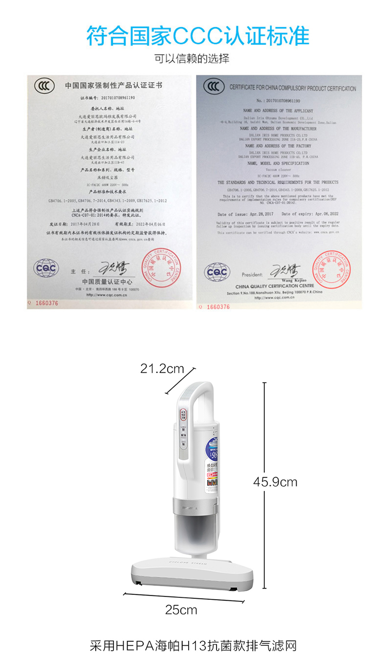 这款爱丽思 IRIS IC-FAC2C 手持式家用床铺除螨仪,是有线的,虽然限制了使用范围,但是可一直使用,400W的功率稳定,吸力不会出现变小的情况;有温风抑螨、高频拍打、强力吸尘、灰尘感知功能;