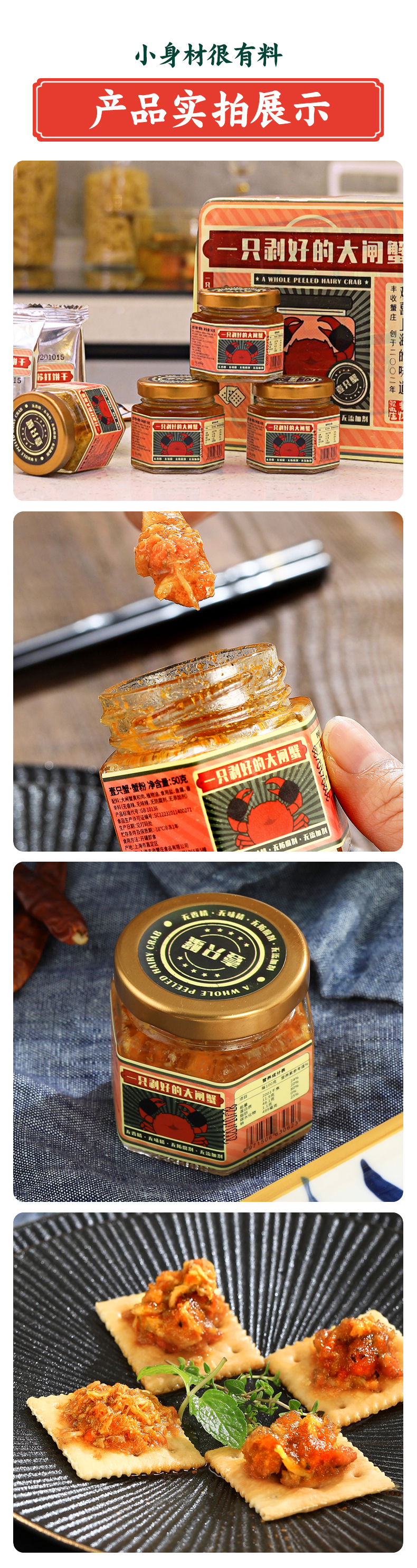 这款丰收蟹庄的整只剥好大闸蟹,每罐都是一整只3两的母蟹,优选全国金奖款的大闸蟹,蒸后人工手剥,去掉蟹腮蟹胃,无香精、味精、防腐剂和各种添加剂,纯蟹肉和蟹黄,增加植物油和鱼露提鲜,到手后冷冻保存,无需开盖和自己手剥,直接开水浸泡5分钟即食。