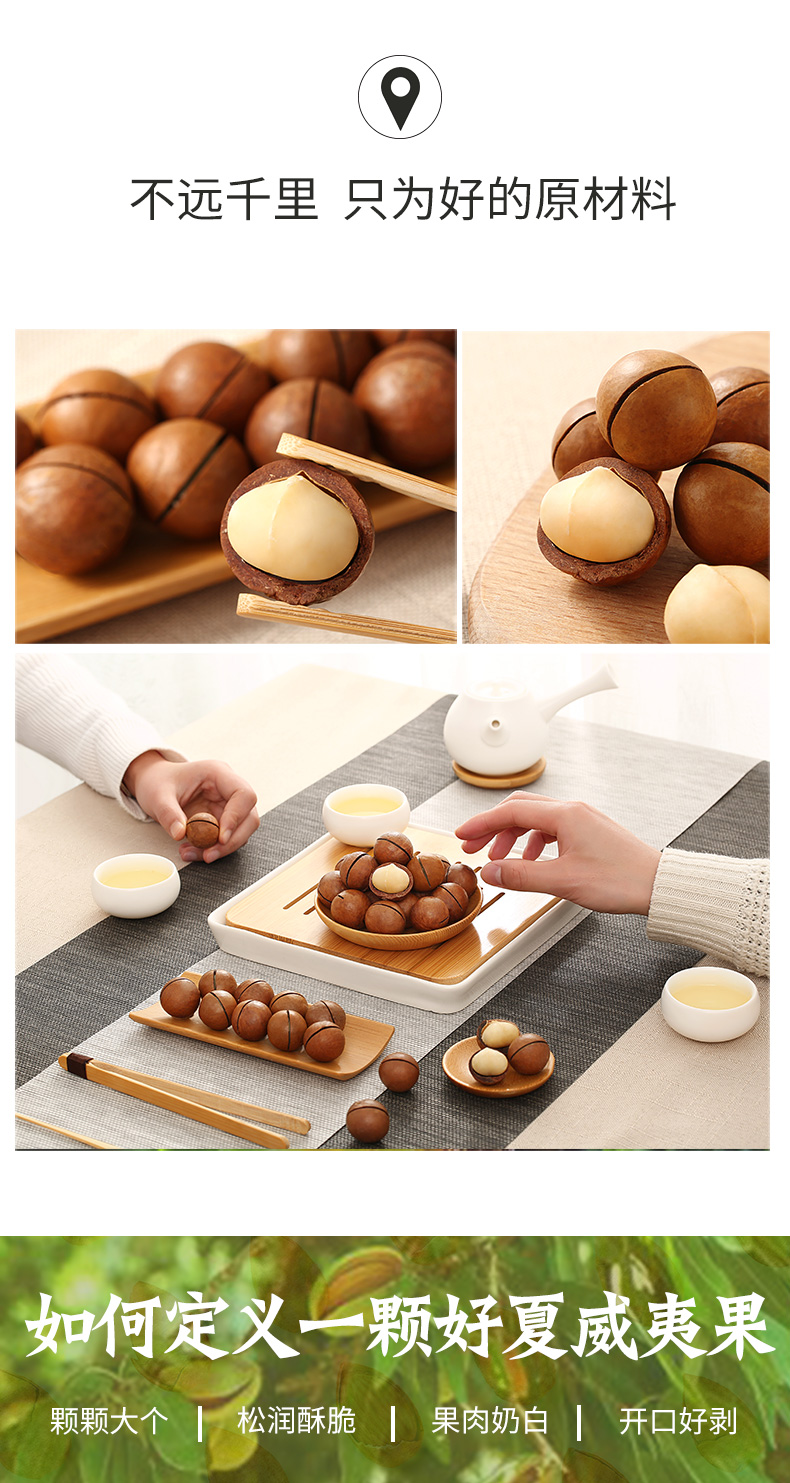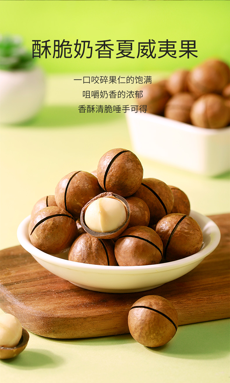 夏威夷果又叫澳洲坚果,果仁香酥滑嫩可口,有独特的奶油香味,是世界上品质较佳的食用坚果,素有“干果皇后”、“世界坚果之王”之美称 ,营养丰富,含油量 70% -79%, 尤其以富含不饱和脂肪酸为特点,以油酸和棕榈酸为主,蛋白质9% ,还含有丰富的钙,磷 ,铁,维生素B1、B2和人体必需的8种氨基酸。