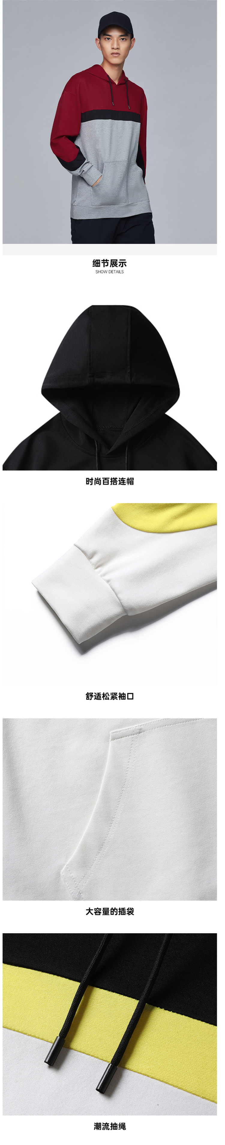 在款式上,合身版型,经典连帽卫衣设计,搭配大大的袋鼠口袋,衣面是三色拼接而成,休闲时尚。