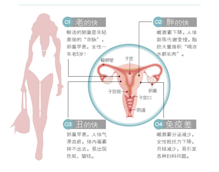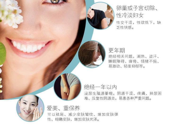 雌性激素是一类主要的女性荷尔蒙,促进女性附性器官成熟及第二性征出现,并维持正常性欲及生殖功能的激素,多产生于卵巢。雌性激素可以使皮肤保持水分,促进皮肤新陈代谢及血液循环,使皮肤柔嫩、细致,还会使乳腺增生,产生乳房、乳晕,并将脂肪选择性的集中在乳房、大腿 、臀部,以此让女性的身材优美且有曲线,产生并维持女性的第二性征。35岁以后,卵巢功能开始减退,女性的衰老及疾病也随之而来,生活质量急剧下降,所以适当补充雌性激素,对女性很有帮助。